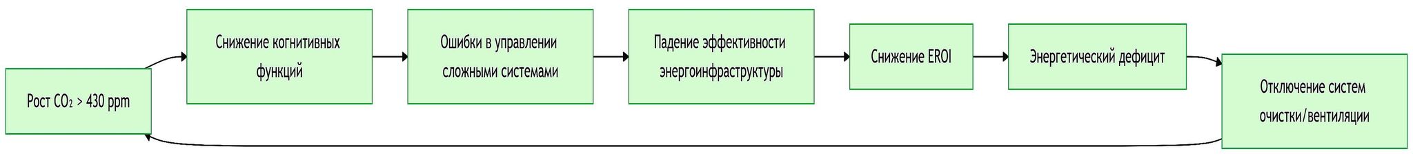 "Мы сидим в герметичном ящике, медленно заполняющемся CO₂, и ругаем себя за лень и тупость, не понимая физиологии происходящего". (Адаптация цитаты Дэвида Уоллеса-Уэллса). Текущие уровни углекислого газа в атмосфере уже сейчас подрывают наш главный ресурс для решения будущих проблем - интеллектуальный потенциал человечества. Когда CO₂ ≥ 500 ppm и EROI упадет ниже 5, у нас не останется ни физических, ни ментальных ресурсов для спасения цивилизации в ее нынешнем виде!