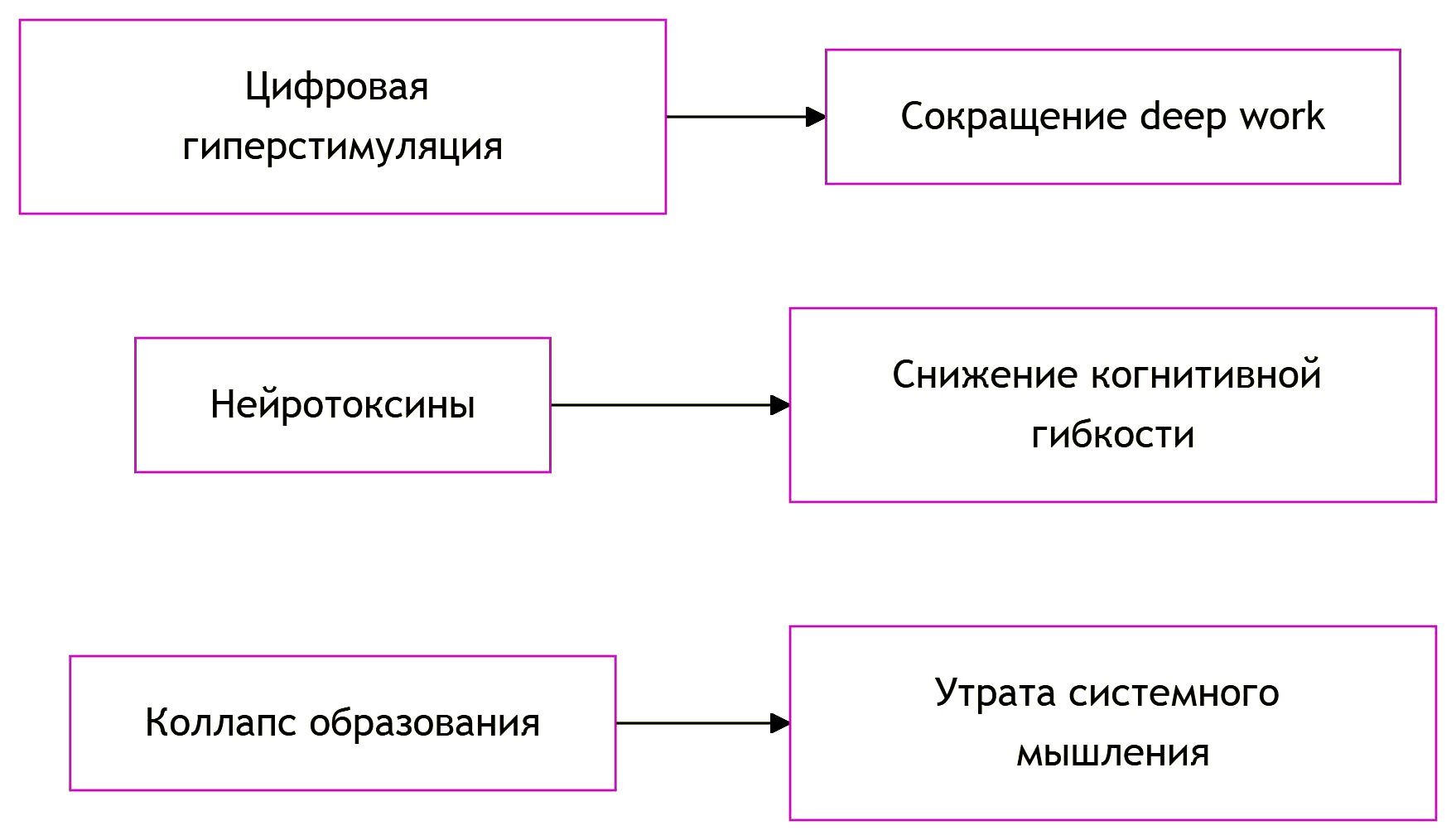 Потеря способности к комплексному планированию (IQ↓ на 11 пунктов)
