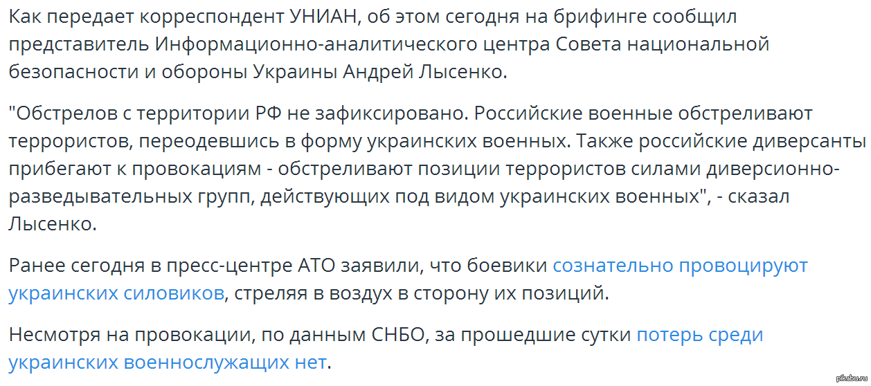 50 2good Угадай, кто виноват в срыве перемирия? 11 лет назад http://www.unian.net/politics/960287-rossiyskie-voennyie-v-ukrainskoy-forme-obstrelivayut-boevikov-na-donbasse-snbo.html Украина Снбо Упоротость Андрей Лысенко