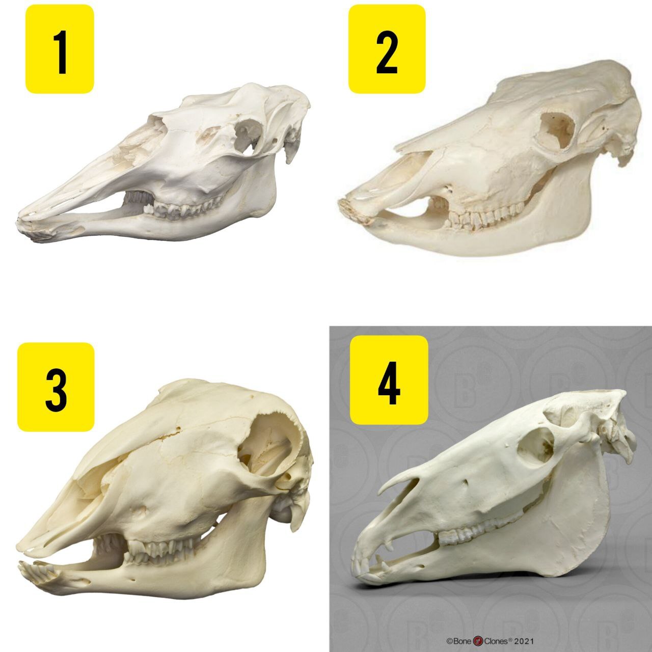 Ответ: тут простенько. Вариант 4 (лошадь) отмечается, так как у коров нет верхних резцов. А дальше пропорции: 1 (лось) слишком длинный, 3 (баран) слишком короткий. Череп коровы под номером 2.