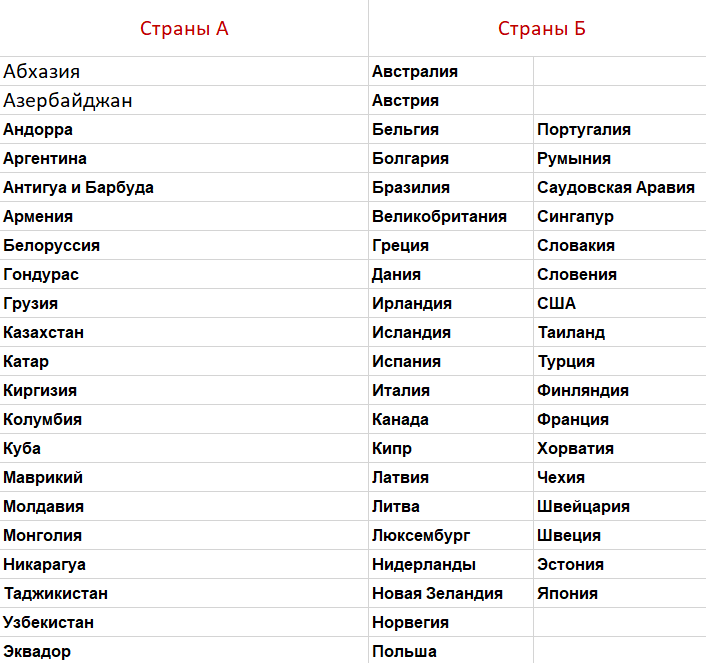 А вот и ответ - первая группа, это страны, гражданам которых не нужна виза для въезда в Россию. Ну а вторая, соответственно, страны, чьих граждан мы не пускаем без визы.