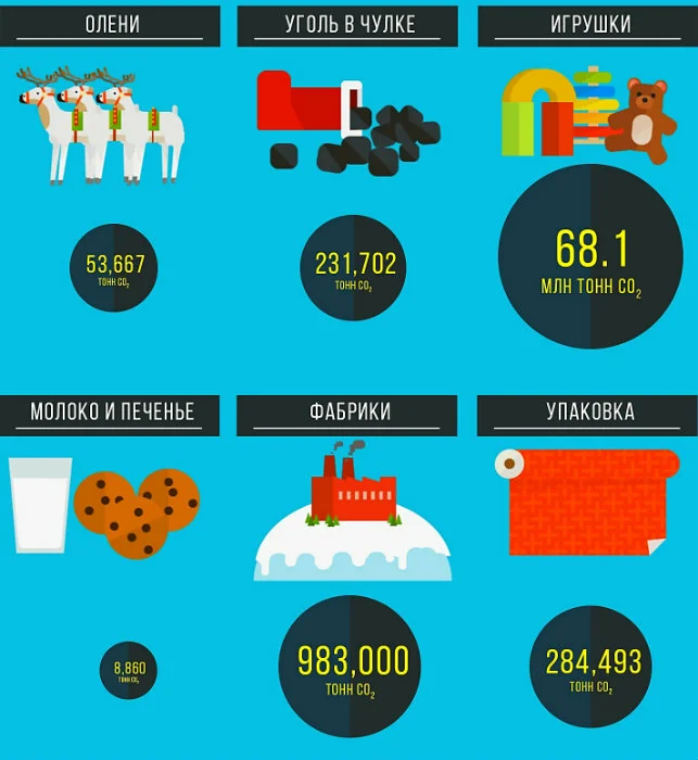 Авторы отчета не поленились подсчитать даже выбросы, которые производят верные спутники Санты — северные олени. Изучив их рацион и особенности пищеварения, ученые определили, сколько газов вырабатывает одно животное. Получилось не так уж и мало: 0.207 граммов метана на километр пути. Если сюда добавить выбросы, связанные с их разведением, кормлением и содержанием, получается 53 667 тонн в пересчете на СО2.
