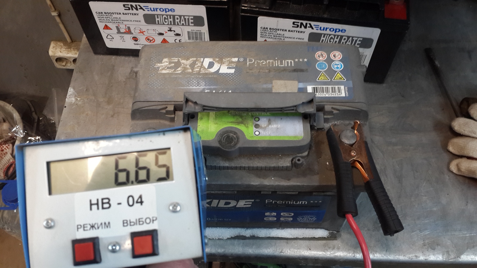 Exide. ЭДС 6,65В. Глубочайший разряд. АКБ холодная (на улице -19), снег на крепежном выступе даже не думает таять. :)