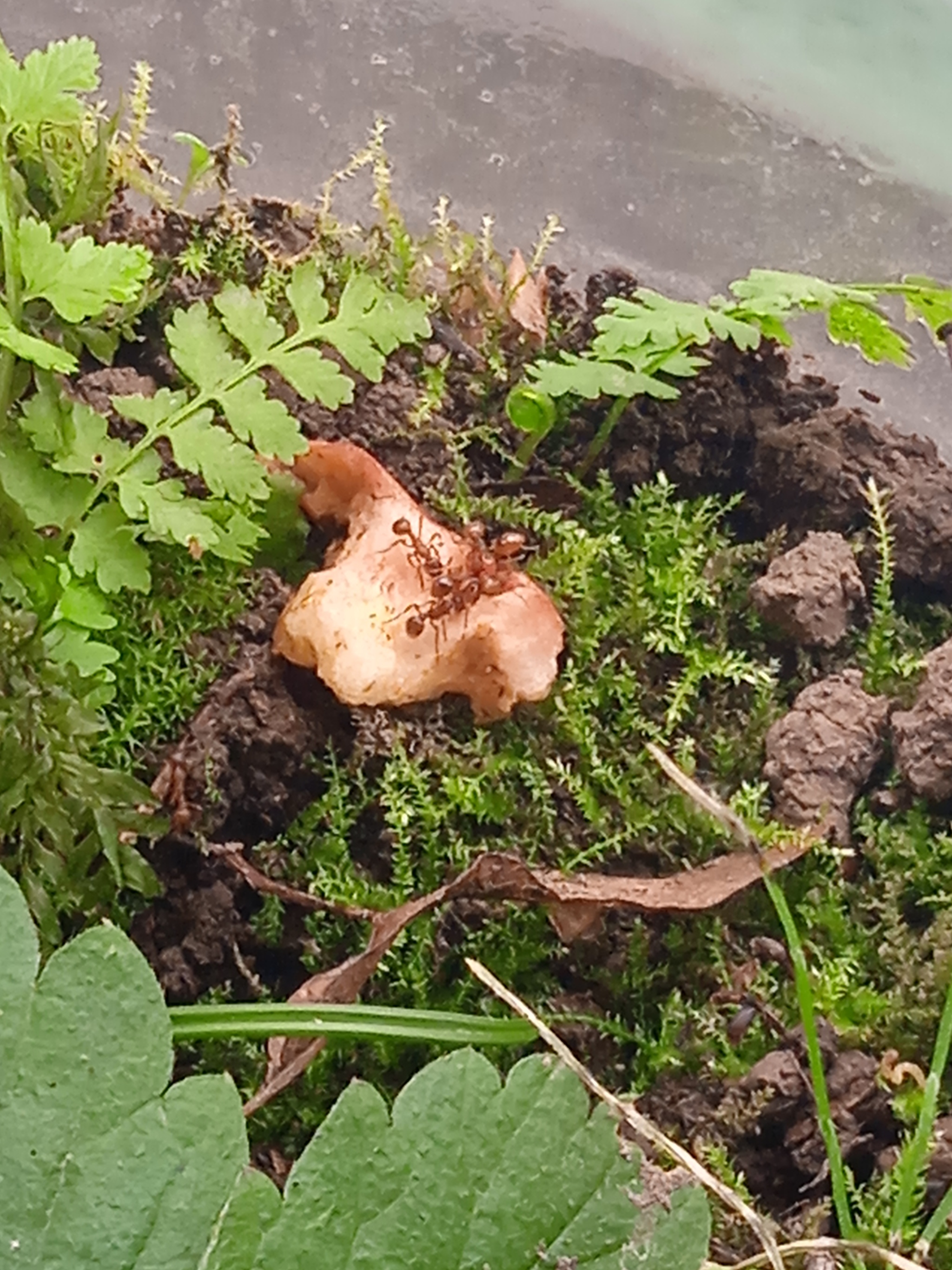 Меня предупредили, что муравьи, скорее всего, съедят мокриц. Пока не заметила ничего подобного. В смысле, живые мокрицы в банке до сих пор есть, и если муравьи их и съели, то далеко не всех. Вот ещё, подкормила муравьев кусочком яблока.