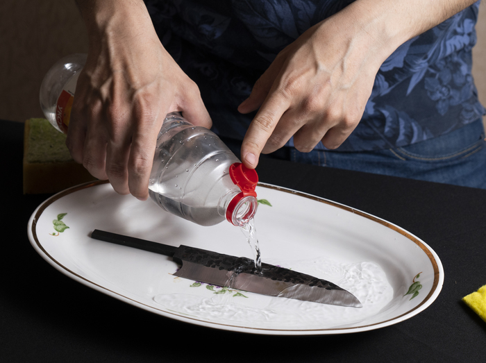 3 этап. Взять обычный столовый белый уксус (9%) и налить в емкость (можно стакан глубокий, можно пластиковую тару). После, просто помещаете клинок так, чтобы только он был полностью погружён в жидкость (рукоять не погружать). И так держать 1-1.5 часа.