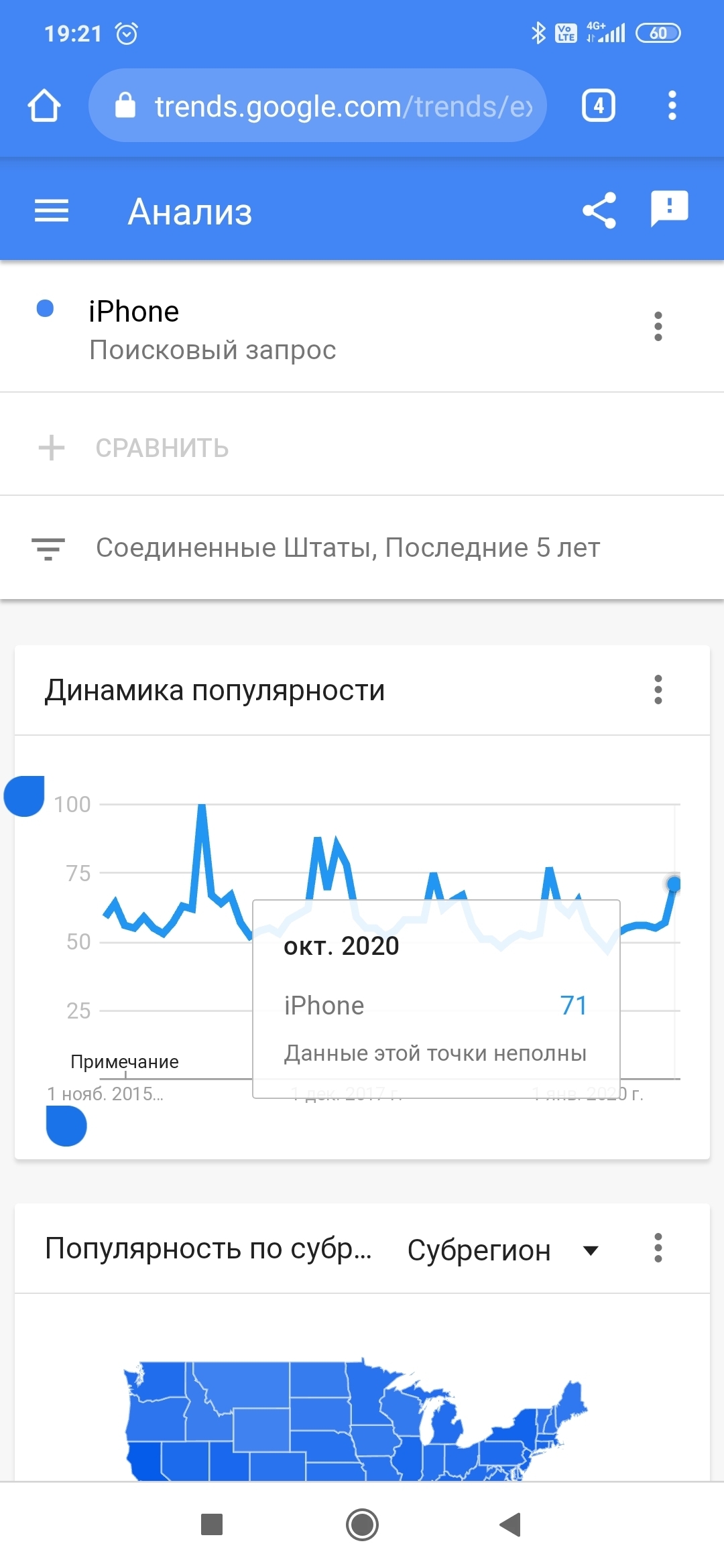 С другой стороны, если отбросить резкие скачки графика при презентации новых устройств, сам график интереса идёт довольно ровно. Возможно, новые айфоны перестали вызывать интерес и удивление, но, тем не менее, любители Apple уже их просто покупают по привычке, не особо следя за новыми функциями и «фишками», которые показываются на презентациях.