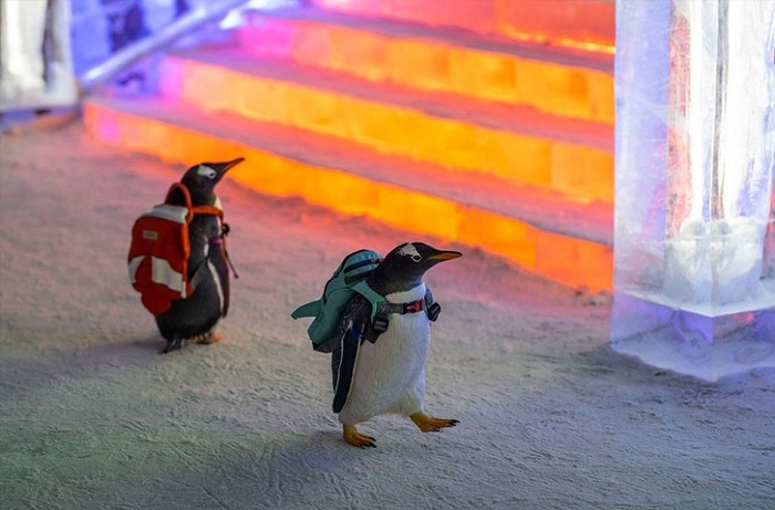 Пингвины на 35-м Харбинском международном фестивале льда и снега. Харбин, Китай.