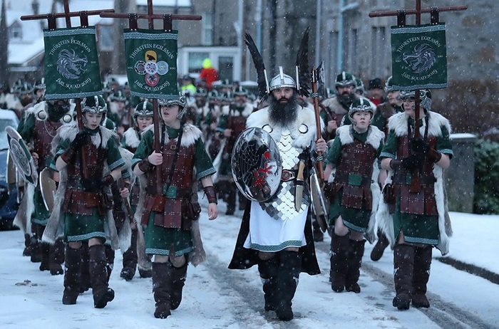 Воевода Джон Николсон ведет свой отряд через заснеженный Леруик на фестивале Апхеллио, Шотландия.