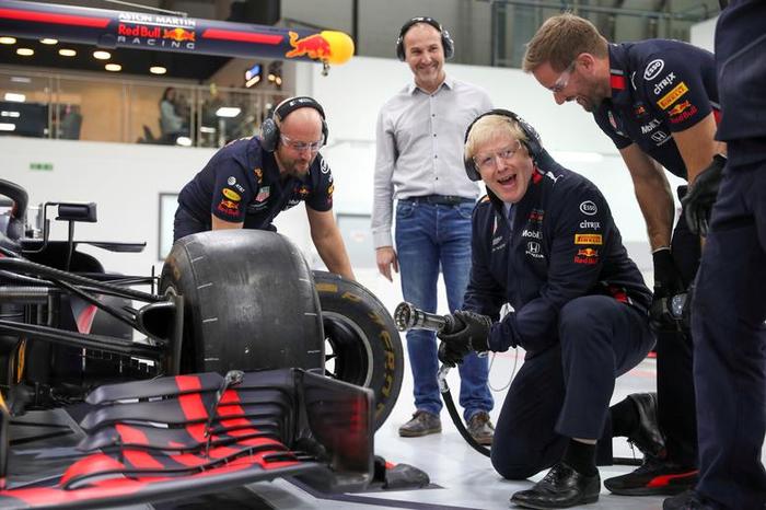 Премьер-министр Великобритании Борис Джонсон меняет летнюю резину в болиде Формулы-1 во время своего визита в Red Bull Racing в Милтон-Кинсе, Великобритания.