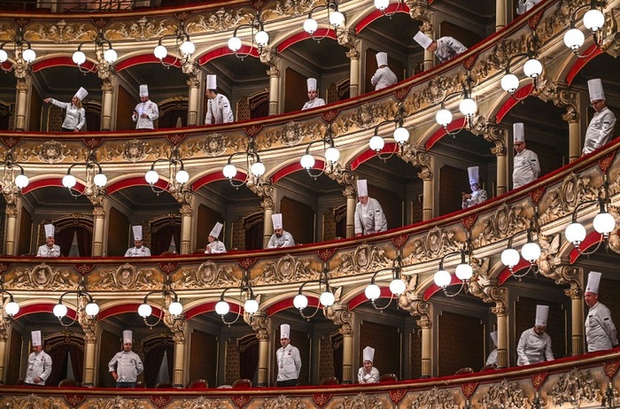 Повара выглядывают со своих мест во время кулинарного фестиваля Cibo Nostrum 2019 в театре Винченцо Беллини в Катании, Италия.