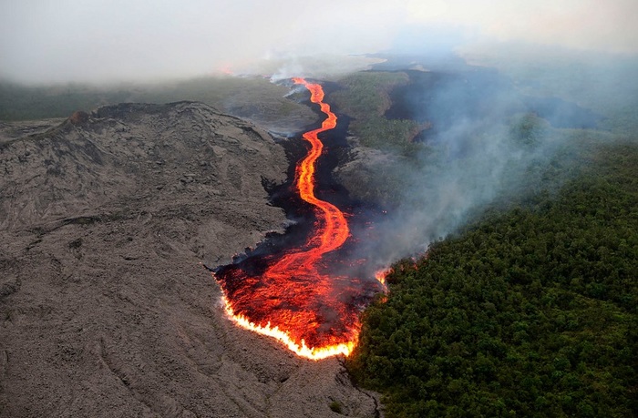 Извержение вулкана Питон-де-ла-Фурнез на острове Реюньон в Индийском океане.