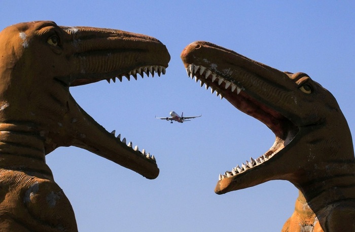 Самолет пролетает над парком скульптур «Долина животных» в Чандигархе, Индия.