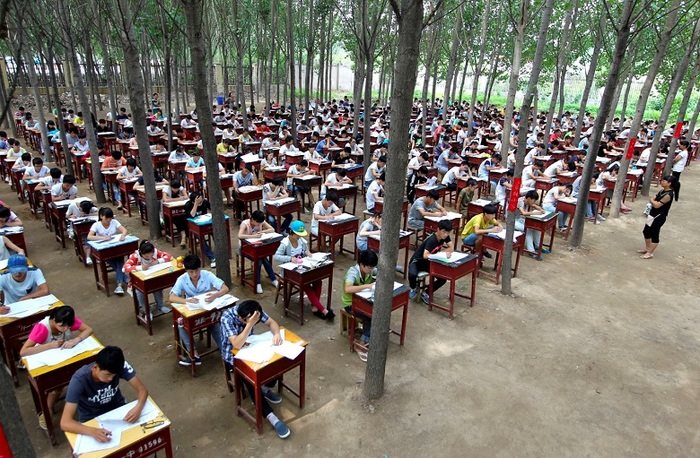 Более 800 учеников старшей школы сдают письменный экзамен в конце семестра среди прилегающего к учебному кампусу леса в уезде Фэнцю, Китай.