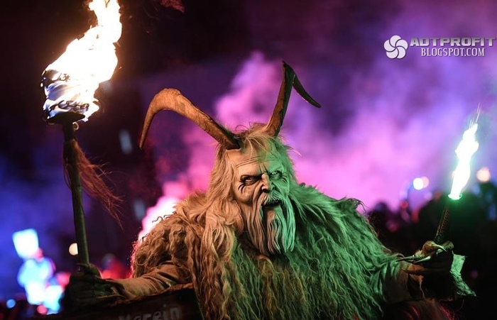 Участник в традиционном костюме Крампуса и маске выступает во время пробега в деревне Бибервир, Австрия, 30 ноября 2019 года.