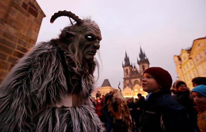 Ребенок смотрит на гуляку, одетого как дьявол, в центре Праги в канун Дня Святого Николая, Чешская Республика.