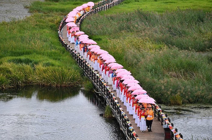 66 пар, одетых в традиционную одежду, принимают участие в древней церемонии любви народа мосо на берегу озера Лугуху, Сычуань, Китай.