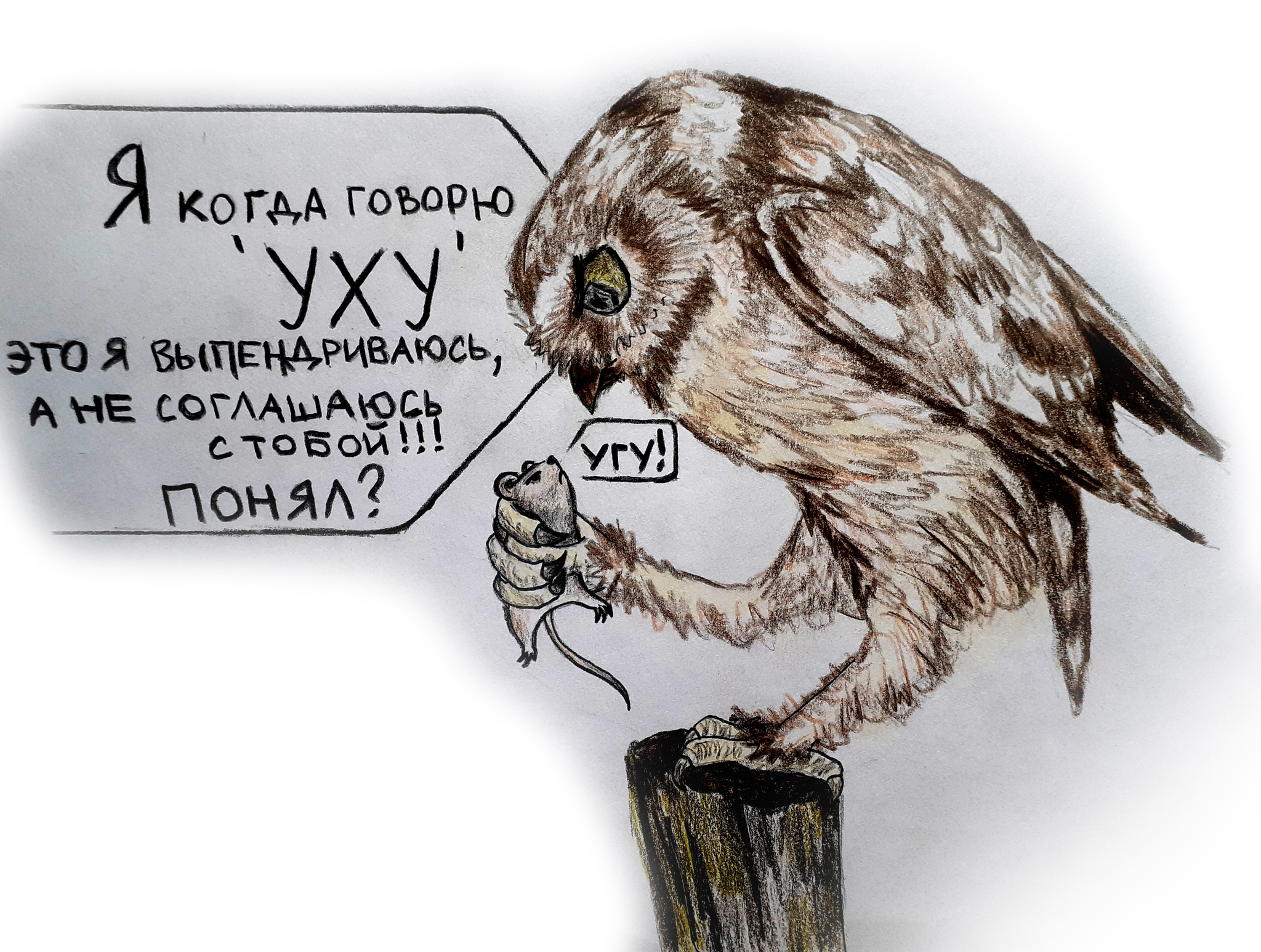 16 etoshtrudel УХУ !!! 9 месяцев назад [моё] Сова Сыч Мышь Рисунок Цветные карандаши Иллюстрации Традиционный арт Картинка с текстом Ещё 0