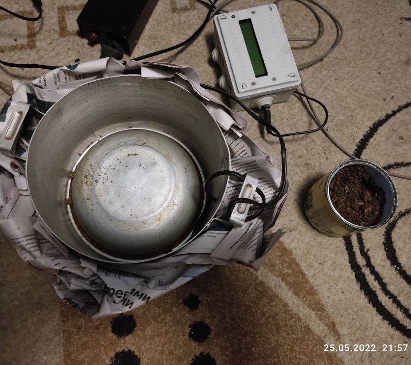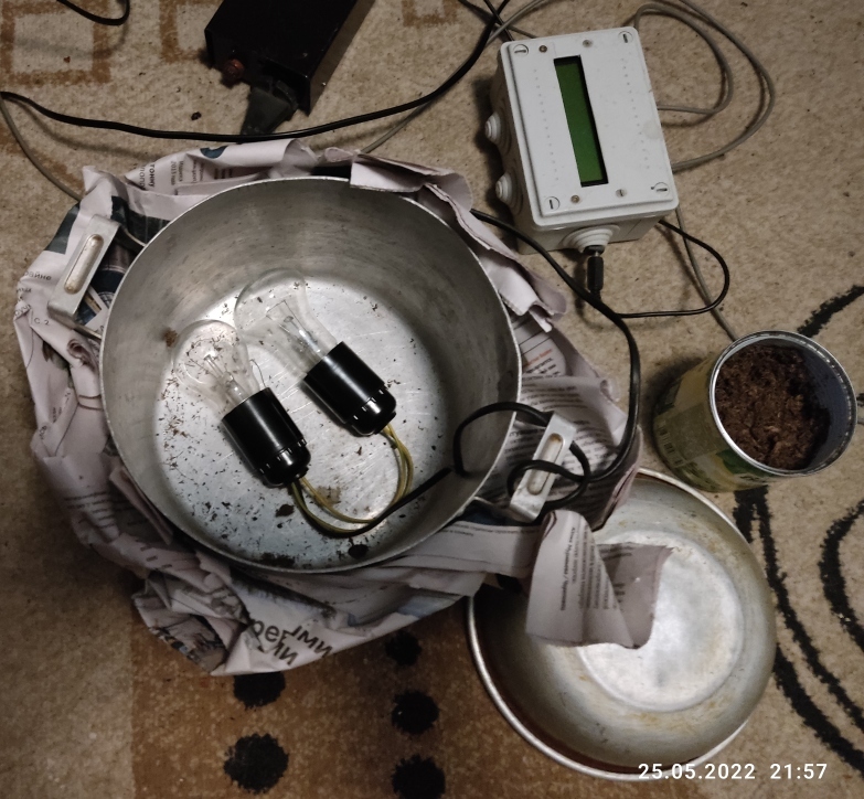 Накрыл их тарелкой. Обернул все газетой для теплоизоляции. На тарелку поставил банку из под горошка с субстатом кокоса. В него поместил черенки и датчик температуры. Подключил терморегулятор. Температуру подогрева выставил +25град. Все поместил в кессон(погреб в гараже). Там +10 град.
