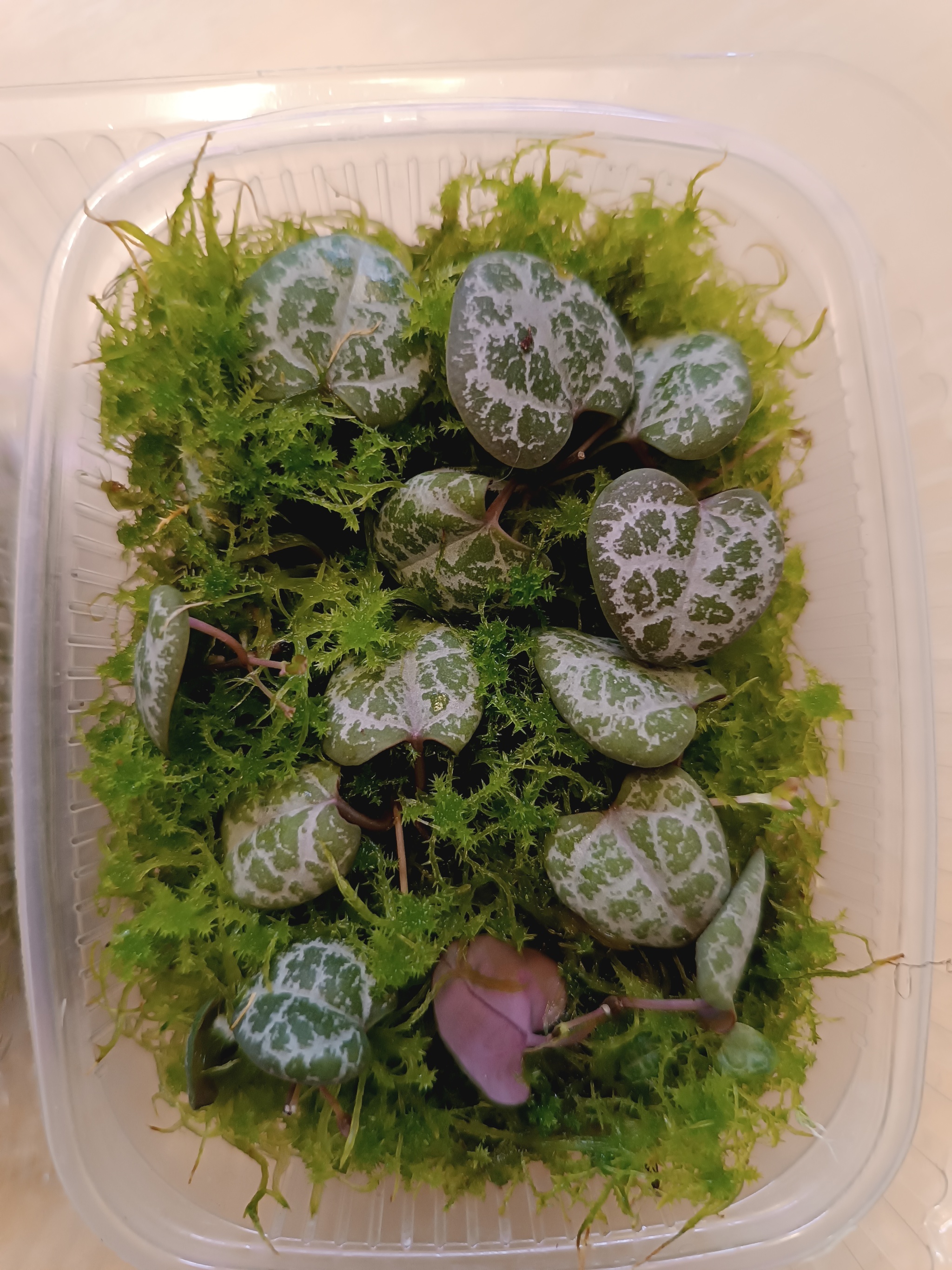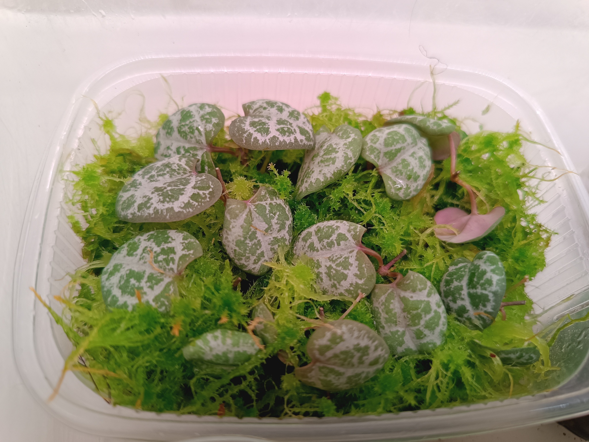 Зелёную плеть порезала по сегментам и поставила укоренять в мох. Сегодня достала посмотреть, там появились уже первые корешки.
