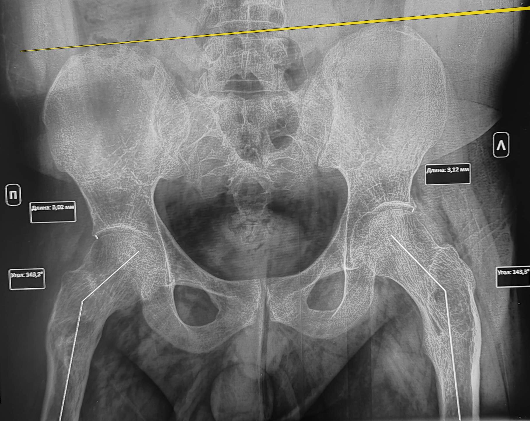 В анамнезе у призывника диагноз- дисплазия тазобедренных суставов, перенесенное оперативное лечение по поводу дисплазии в детстве. По данным рентгенографии костей таза: ШДУ справа 143 град, слева 143 град, сужение суставной щели справа до 3 мм, слева до 3.1 мм, остеофиты по верхне-наружным краям суставных щелей, шейка правой бедренной кости укорочена ,перекос таза вправо. Двусторонние участки разряжения костной ткани в межвертельной области(более выраженно справа)-как следствие перенесенных оперативных вмешательств. Заключение: Coxa valga bilateralis как следствие дисплазии тазобедренных суставов. Вторичный двусторонний коксартроз 1ст.