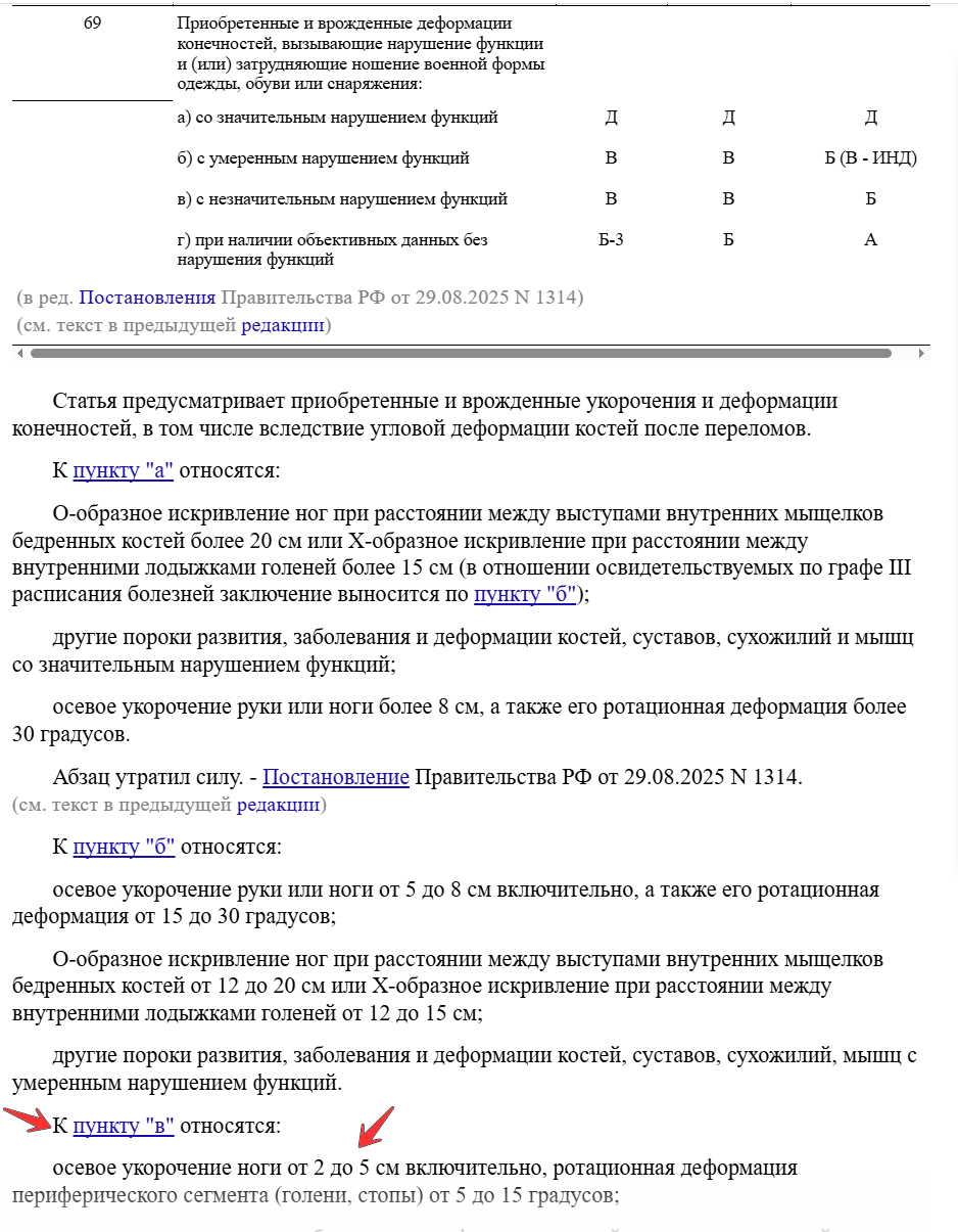 У выше представленного призывника, при измерении истинной длины нижних конечностей, выявлено укорочение правой нижней конечности на 2.5 см., что соответствует ст.69в-В(ограниченно годен к в/сл)