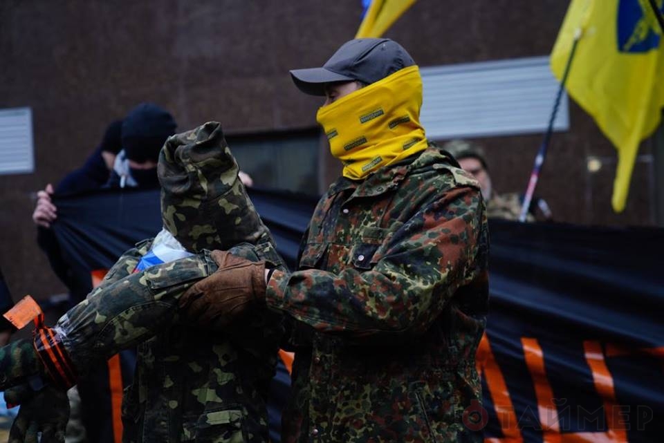 С собой они принесли чучело в военной форме и с российским флагом на груди. Сначала ему отрубили голову, а затем сожгли.