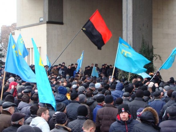 Симферополь, здание Госсовета Крыма, 26 февраля 2014 года. Если будете смотреть фото и видеохронику по этому событию - обратите внимание на людей в красных куртках и черных шапках, стоящих на расстоянии друг от друга в толпе и раздающих указания.