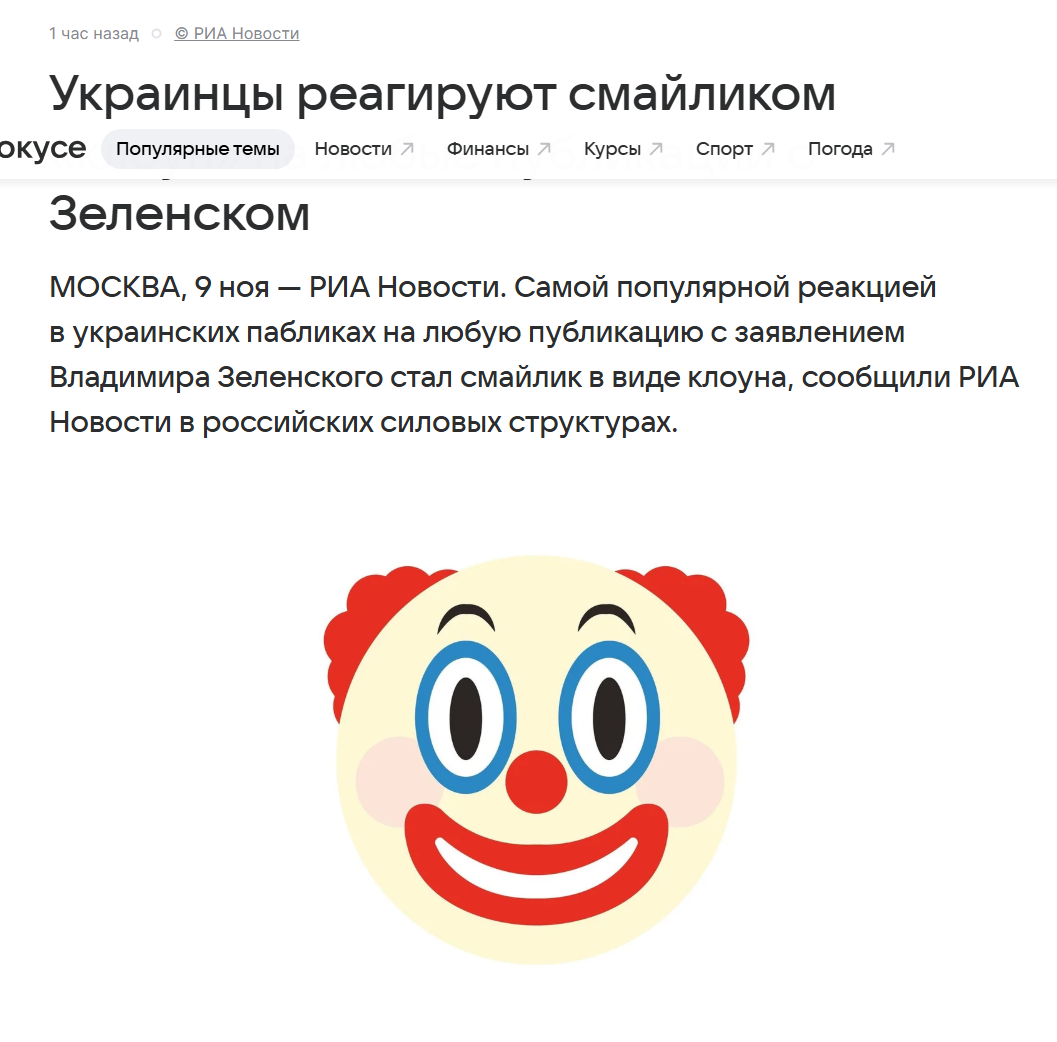 «Если взглянуть на украинские паблики, можно заметить одну интересную особенность: самой популярной реакцией на любой пост с заявлением Зеленского является клоун», — сказал собеседник агентства.
