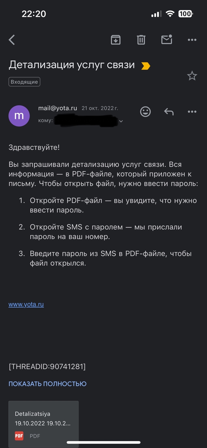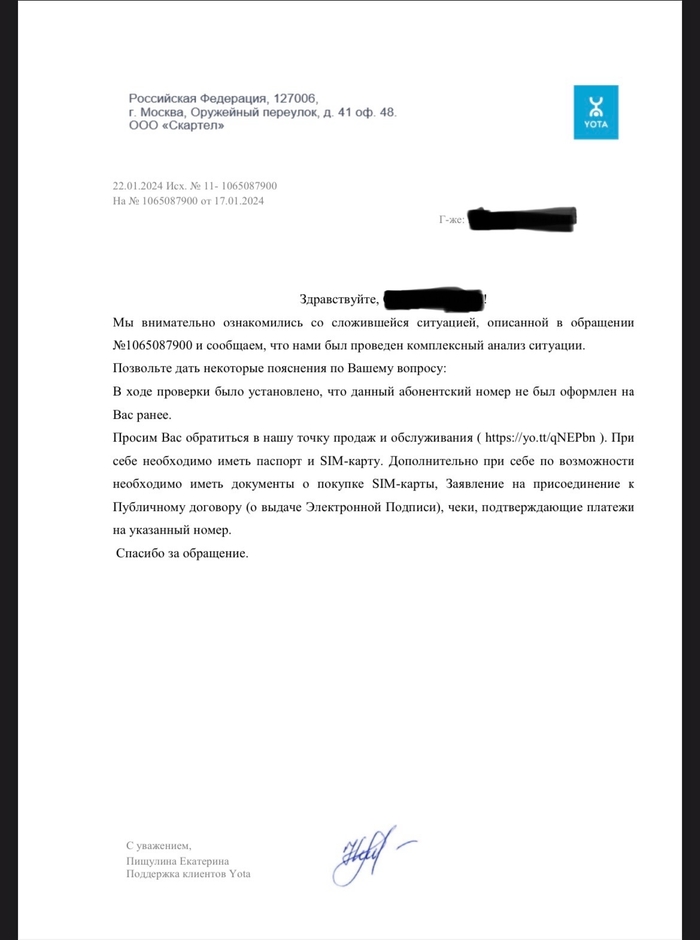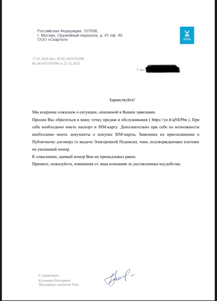 За последний год номером пользовалась редко, тк переехала заграницу. Но сим-карта в телефоне, раз в 90 дней пополняла баланс, чтобы номер не заблокировали. На Новый год перед поездкой в Россию стала уточнять, на сколько нужно пополнить баланс, чтобы подключить тариф. Оказалось, откуда-то появилась скидка 50%. Чтобы ответить, откуда она, поддержка запросила паспортные данные. И на тебе: «Номер оформлен не на вас». Пришли к тому, что нужно обратиться в точку для переоформления. Каким образом можно переоформить его без присутствия текущего владельца, непонятно. Сказали, что у меня какой-то особенный случай, так можно. Попутно составила претензию, где приложила скриншоты полученных детализаций, а по более старой заявке в письме ко мне обращались по имени и отчеству как к владельцу номера.