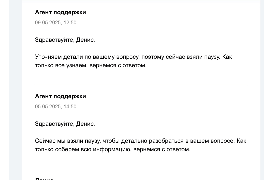 Звоню в поддержку. Они отвечают что мы занимаемся вашим вопросом ждите. Звонил я им несколько раз отвечают они на почту шаблоном и больше никакой информации не дают.
