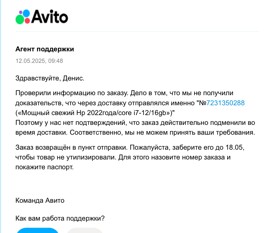Покупатель разумеется отказался забирать посылку и она вернулась обратно. Я пошел ее забирать, уже зная что внутри не мой ноутбук, попросил работника пункта выдачи снять на видео как я распаковываю посылку. Мы все сняли, составили акт об отказе от посылки, и я уже дома составил заявку на возврат на авито и загрузил все фотки и видео что у меня были.