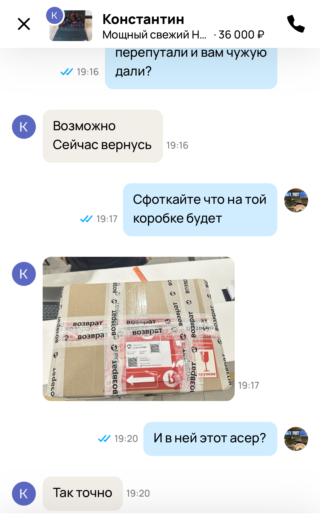 Спустя какое-то время посылку доставили в пункт назначения, покупатель пришел его забирать и обнаружилось что внутри лежит уже не мой ноутбук, а какой-то acer меньше по размеру, на много дешевле, старее и слабее моего.