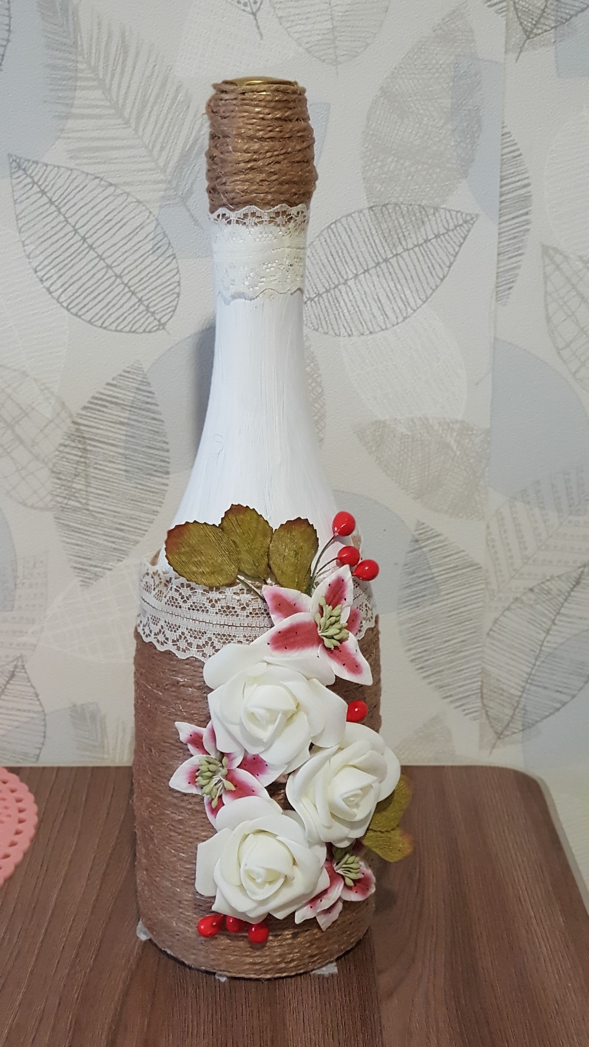 KoshkaAlkoshka Украшения для бутылок 5 лет назад Здравствуйте. Будущая жена загорелась желанием сама украсить бутылки для шампанского на свадьбу.Хвастаюсь!P.S. извините за освещение, пасмурно и мыльница [моё] Шампанское Декор Творчество Длиннопост Ещё 0
