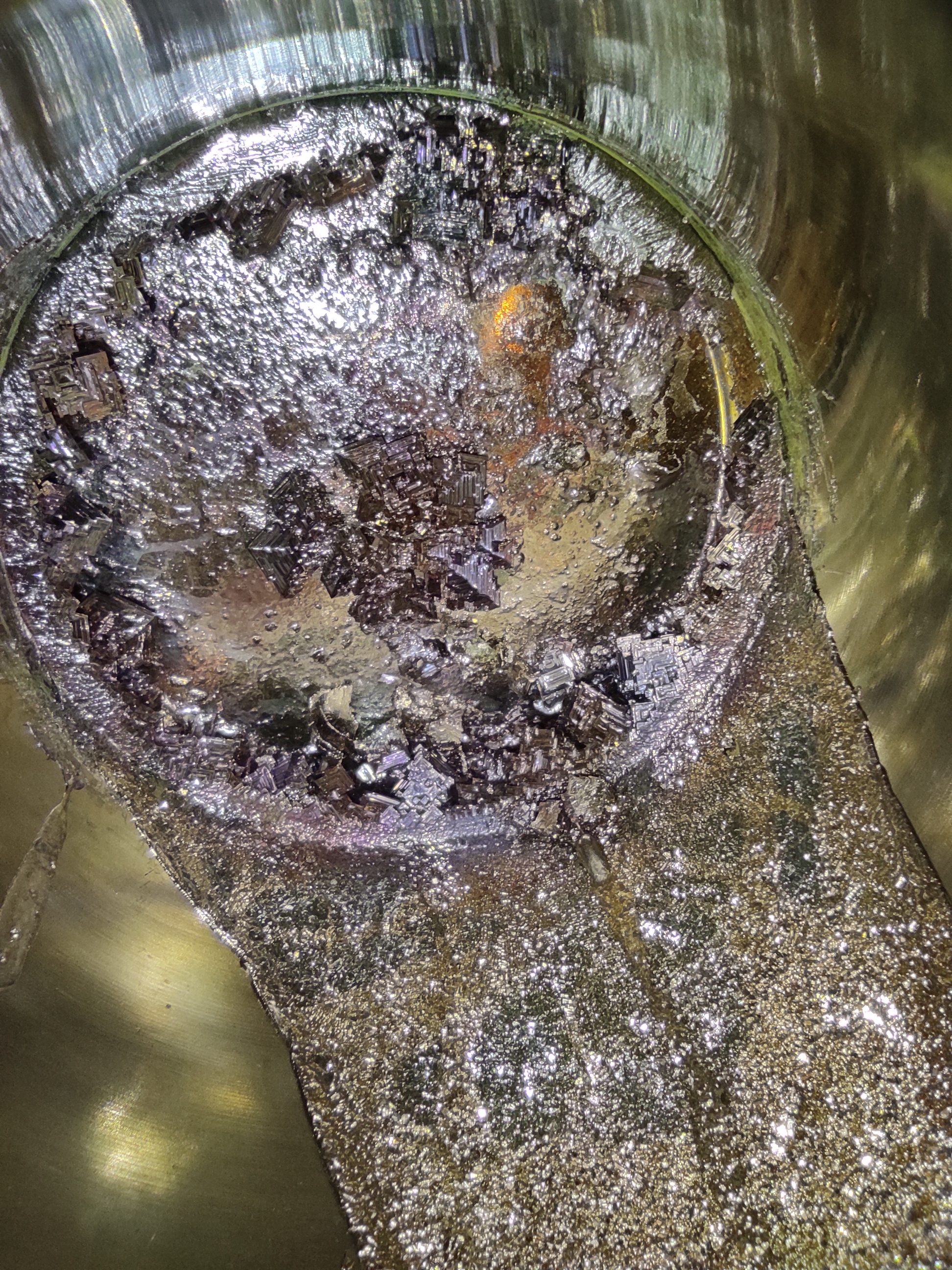 Светлячок вырастила кристаллы висмута, и они мне понравились) Вдохновившись, я предложила сделать из них авторские украшения, ведь двух одинаковых ни у кого не будет, они как снежинки – каждый кристалл уникален, то есть существует в единственном и неповторимом экземпляре. Особенно мне понравился отлив висмута, который осел на стенке емкости, когда лишний метал сливали, чтобы на дне могли образоваться кристаллы. Вот этот: