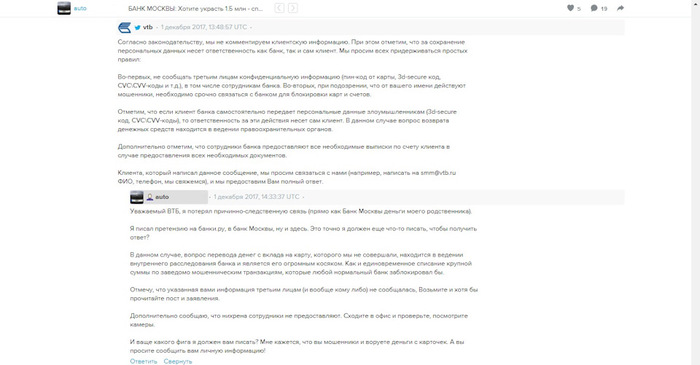 Вторым ответил ВТБ. И тоже ничего интересного, т.к. это стопудово ответ бота. Зато понятно, что тот, кто это писал не только не разбирался с проблемой, но даже отзыв на banki.ru не удосужился прочесть. В общем, вот скрин наших комментов к посту в ЖЖ.