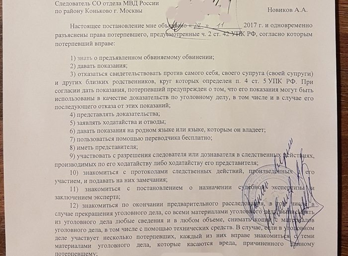Поэтому все, что удалось получить на руки к сегодняшнему моменту – это постановление от 28 числа, признающее потерпевшую потерпевшей с ущербом 15 тыс. рублей.