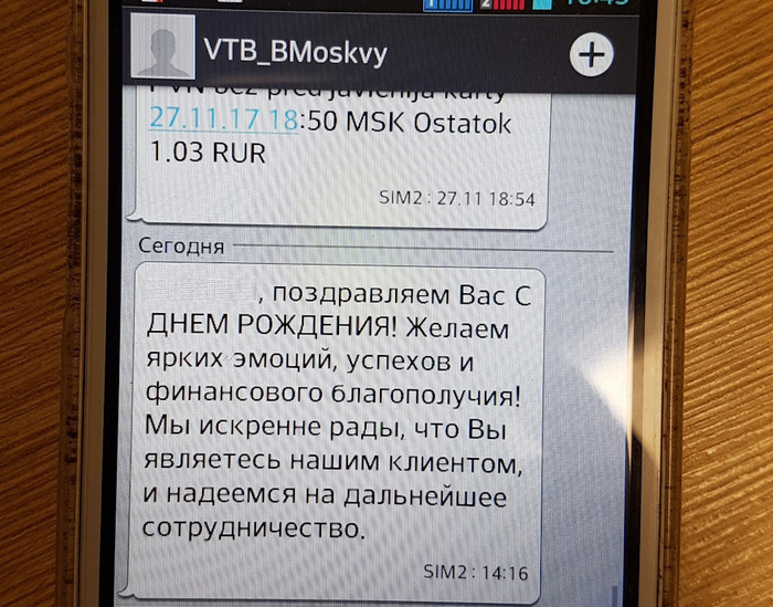 Первым ответил Банк Москвы. Он поздравил потерпевшую с днем рождения: