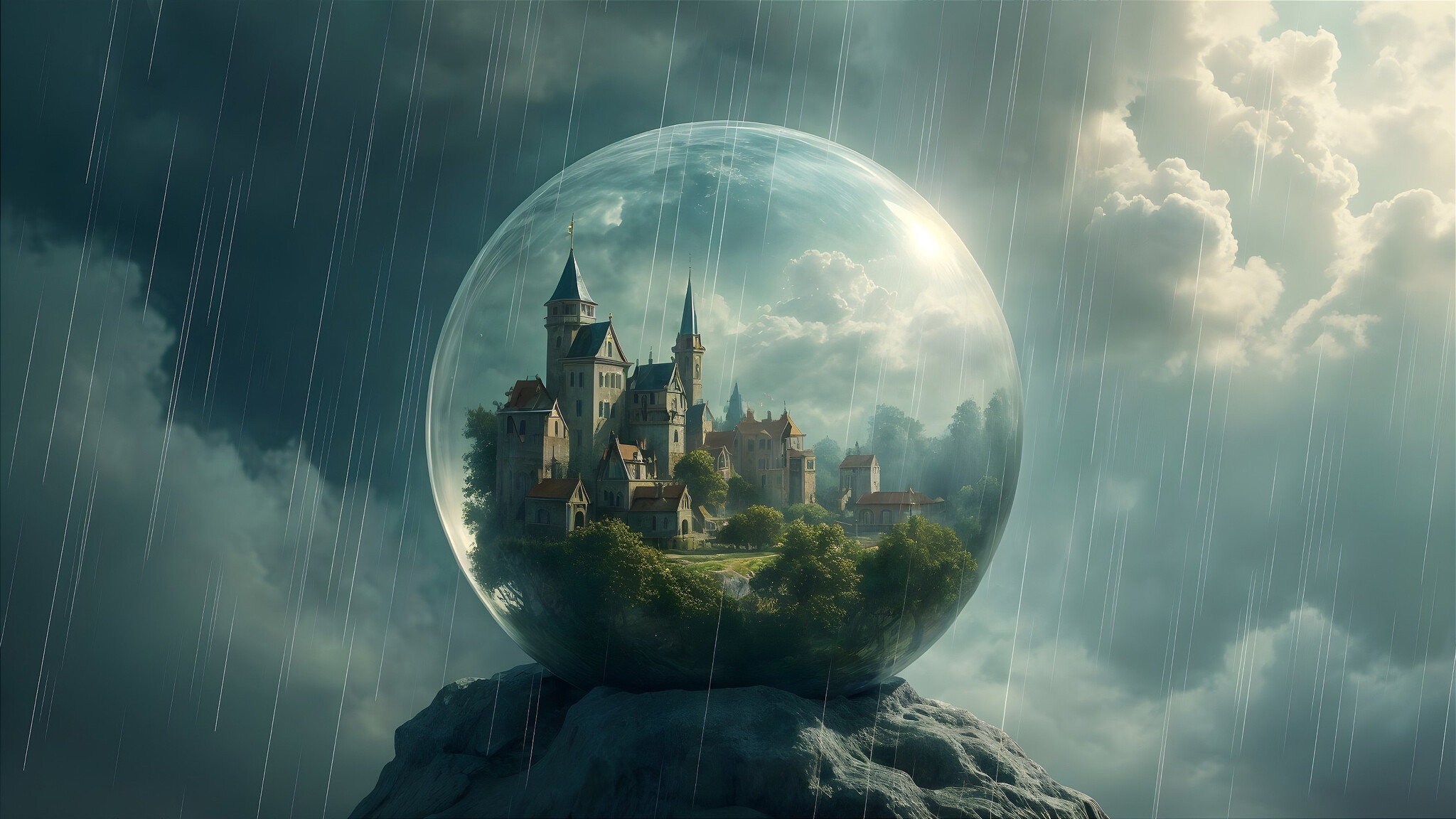 Prompt: Stormy village in crystal ball, heavy rain, dramatic clouds, soft pastel watercolor, white highlights, Jean-Baptiste Monge style, artistic miniature, golden ratio composition, volumetric lighting, surreal Mythpunk, hyperrealistic details, HDR, elegant fantasy, matte background, close-up, sharp focus, intricate details, beautiful and fantastic view.