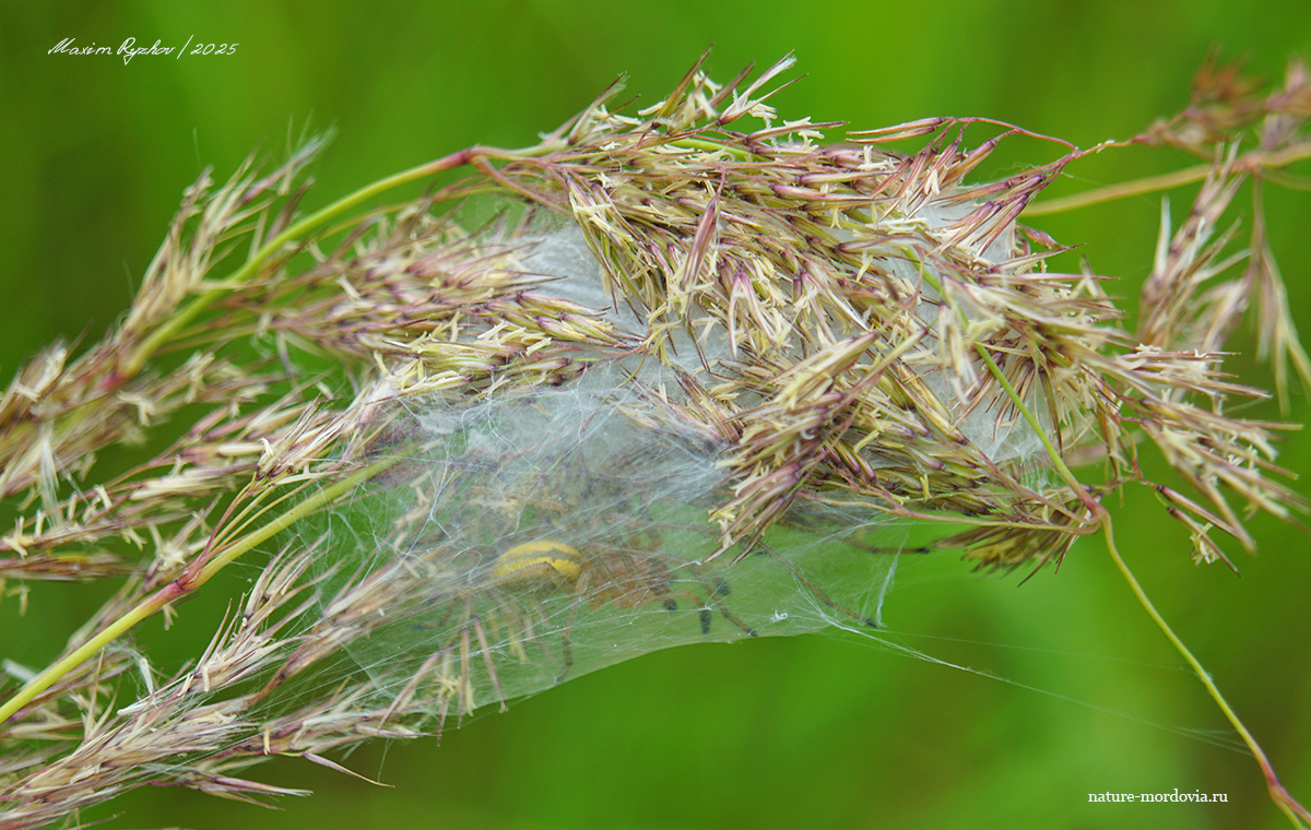 Логово желтосумного колющего паука (Cheiracanthium punctorium). Снизу видно самца, который ждет подходящего момента чтобы пробраться к самке, которая располагается выше (не видно)