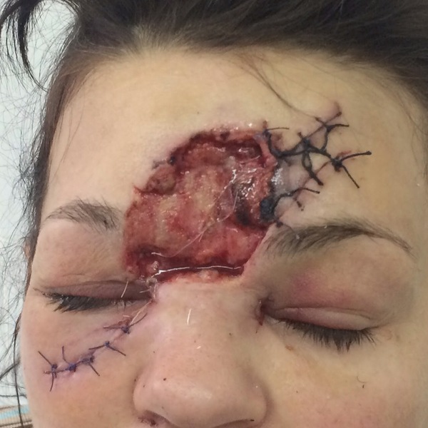 Пьяный товарищ полез повоспитывать овчарку. Результат - собака зацепила зубом за нижнее веко глаза и довела разрыв до верхней губы. Собаку отогнали, лицо положили на место и в больничку. Нормально зашили, даже иннервация восстановилась.