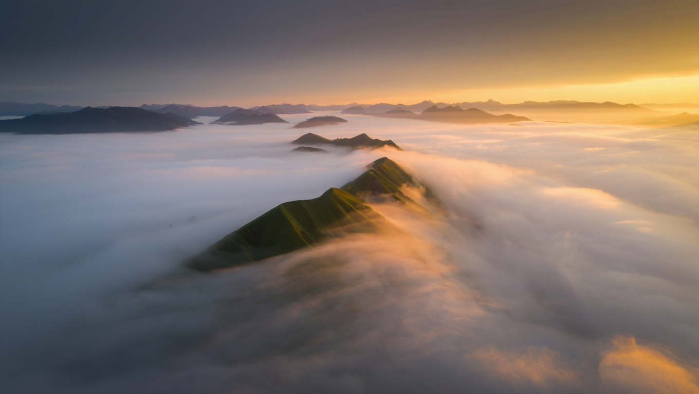 Промпт: An aerial landscape photograph captured at sunrise showing a dramatic mountain ridge emerging from a sea of clouds. The ridge's green slopes are illuminated by golden morning light, creating a strong leading line through the composition. Multiple mountain ranges stretch to the horizon, their peaks partially obscured by clouds and atmospheric haze. The sky transitions from dark blue-gray tones to warm golden hues, while a thick blanket of white clouds fills the valleys, creating an ethereal atmosphere. The image demonstrates professional techniques in landscape photography, with perfect exposure balance and sharp detail throughout.