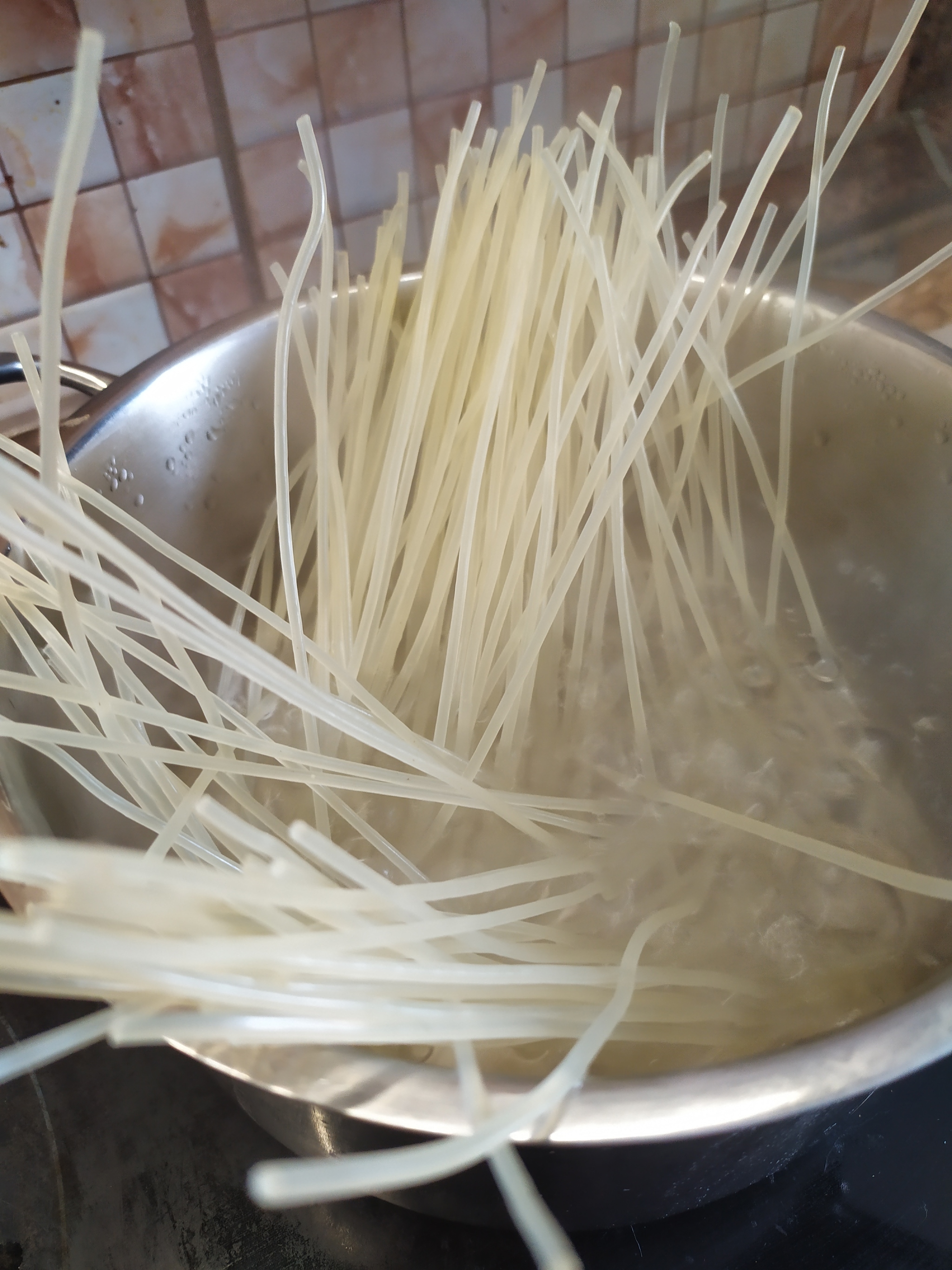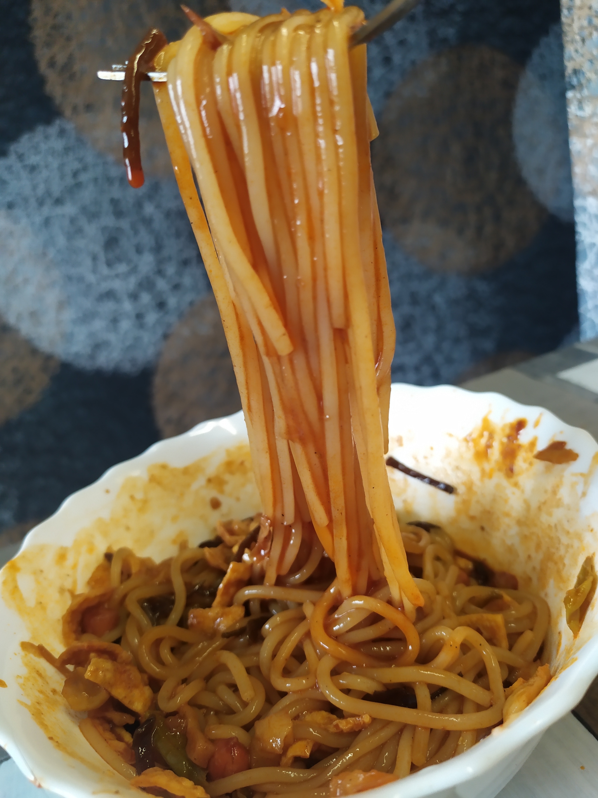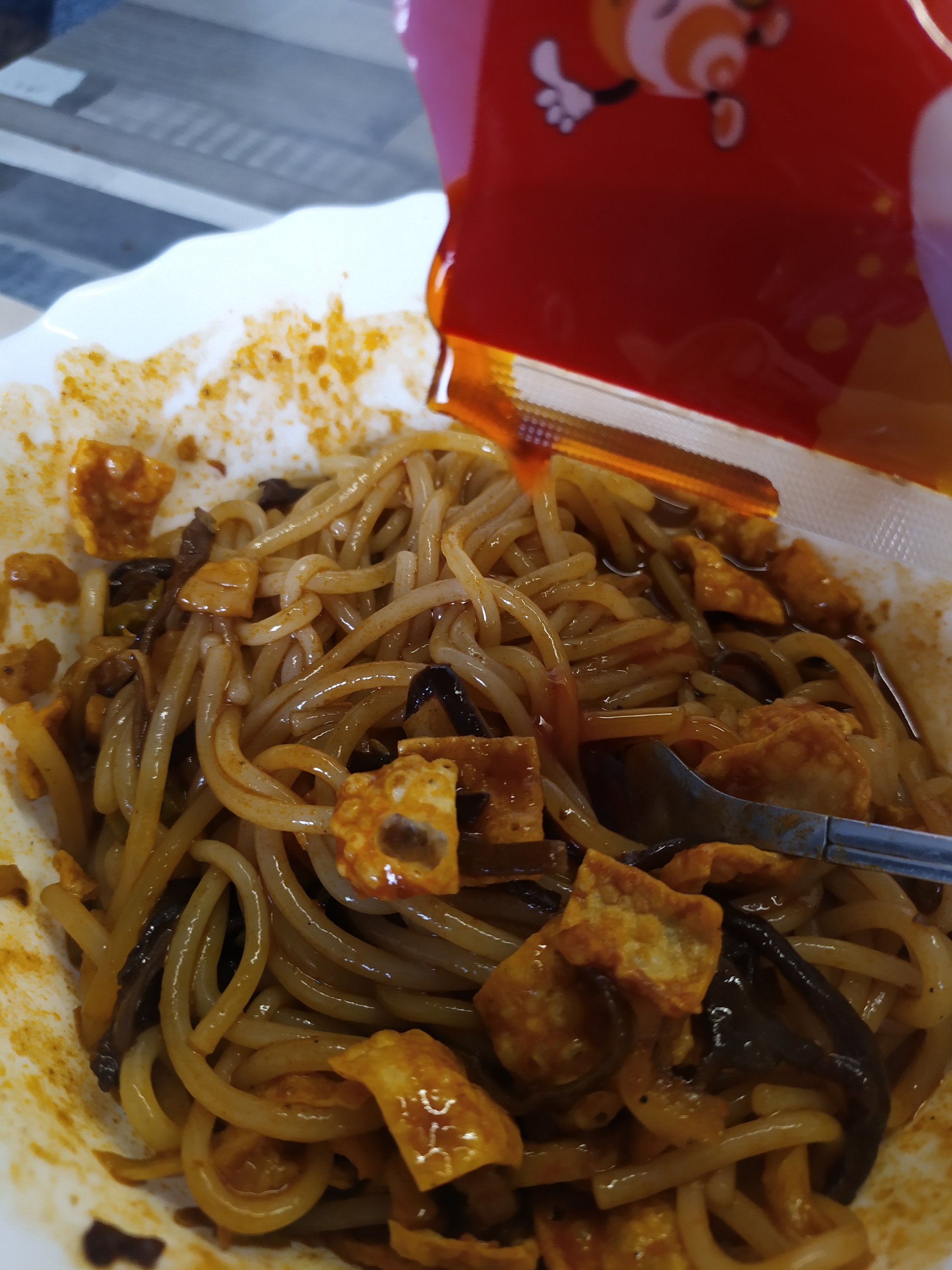 В готовую лапшу добавляем: 186,7 грамм кипятка и всю остальную хрень из пакетов.