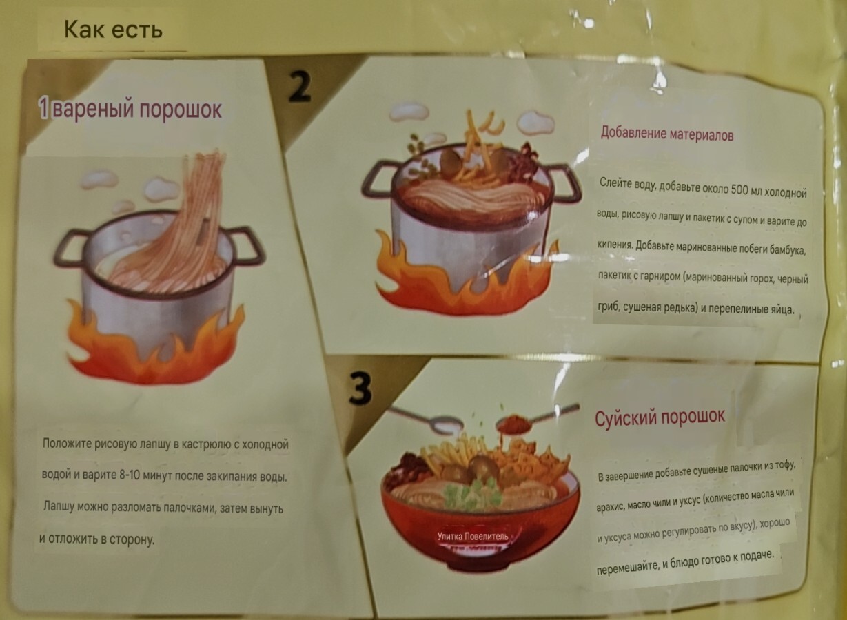 Инструкция по приготовлению длинная, но понятная. Готовится лапша также, как и её уже ранее исследованные собратья.