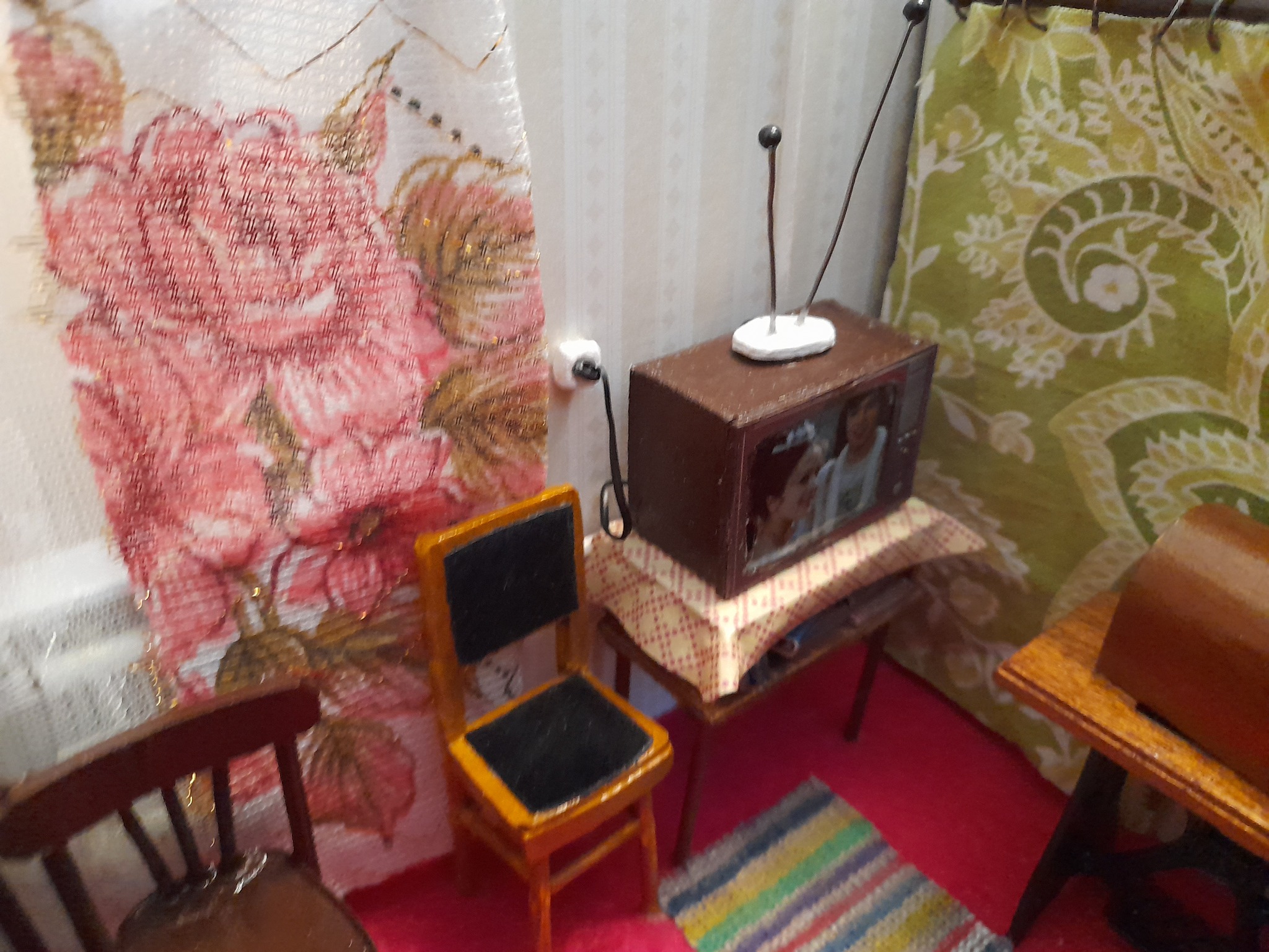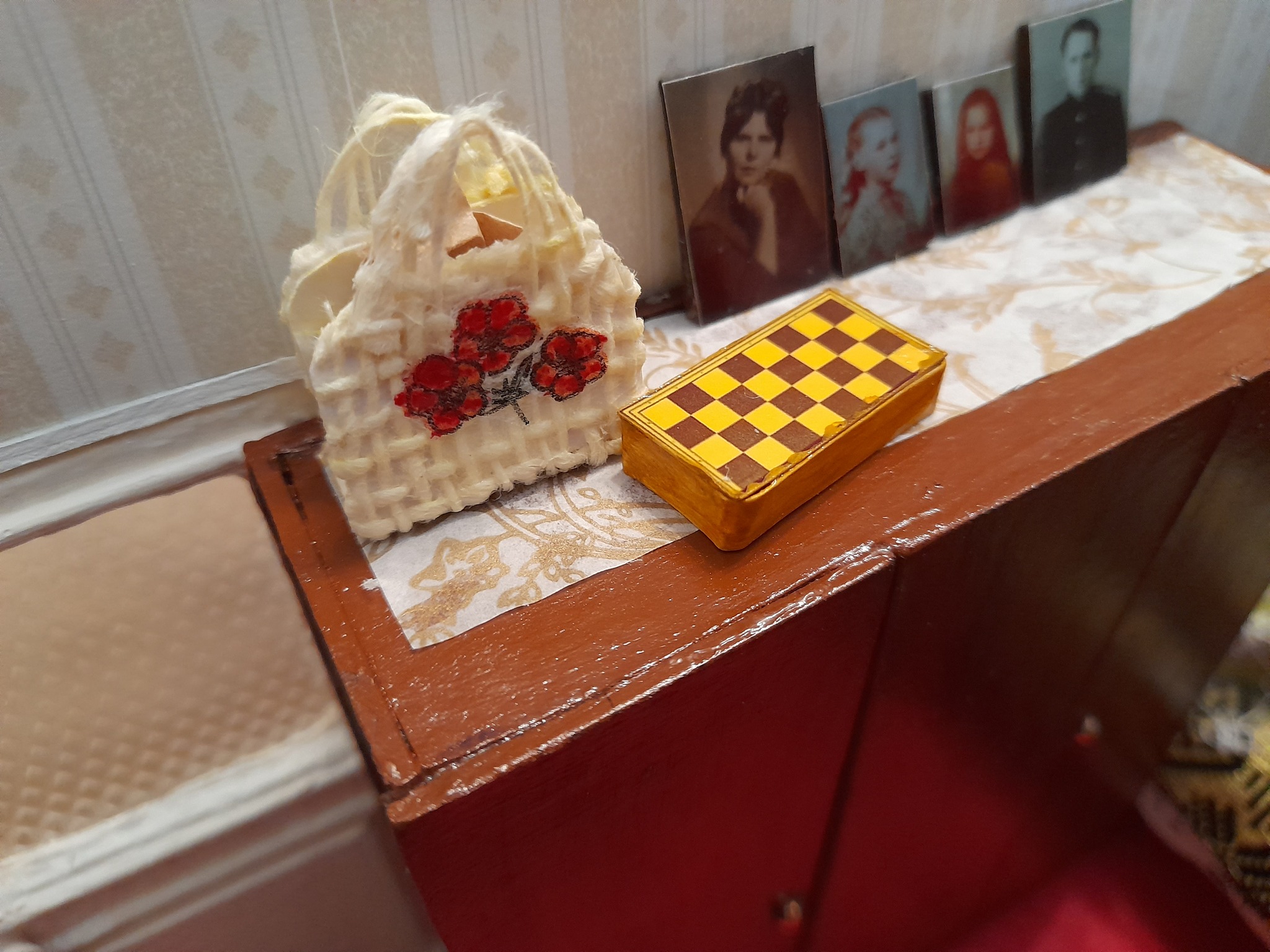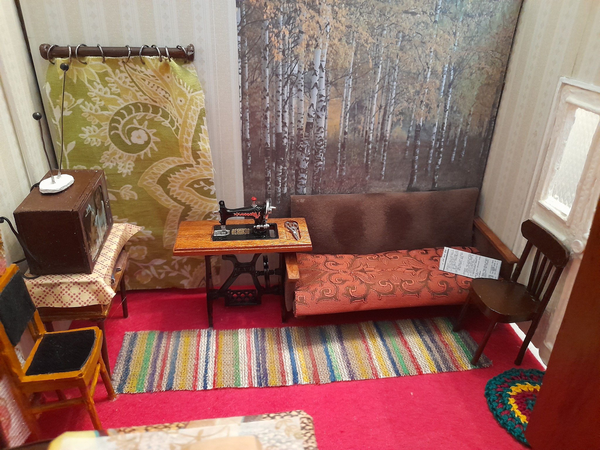 Немножко описание процесса. Масштаб не знаю, наверное, 1:14, размер комнаты 30*25*18 см, материалы - картон, акриловые краски, распечатки, ткани, клеёнка, шпажки, зубочистки, лак для ногтей, проволока, покупная швейная машинка (футляр сделан из картона).