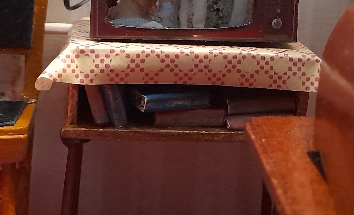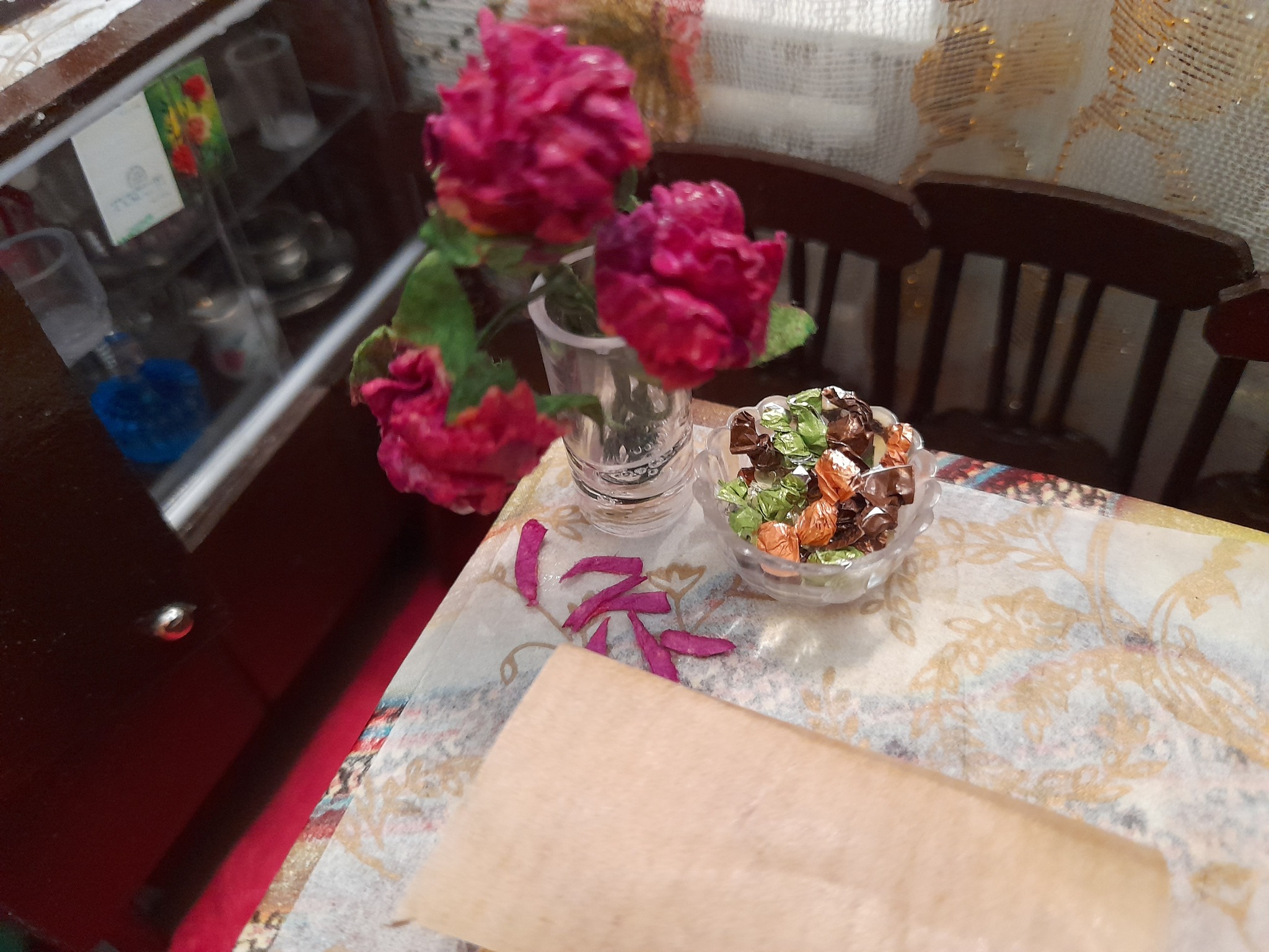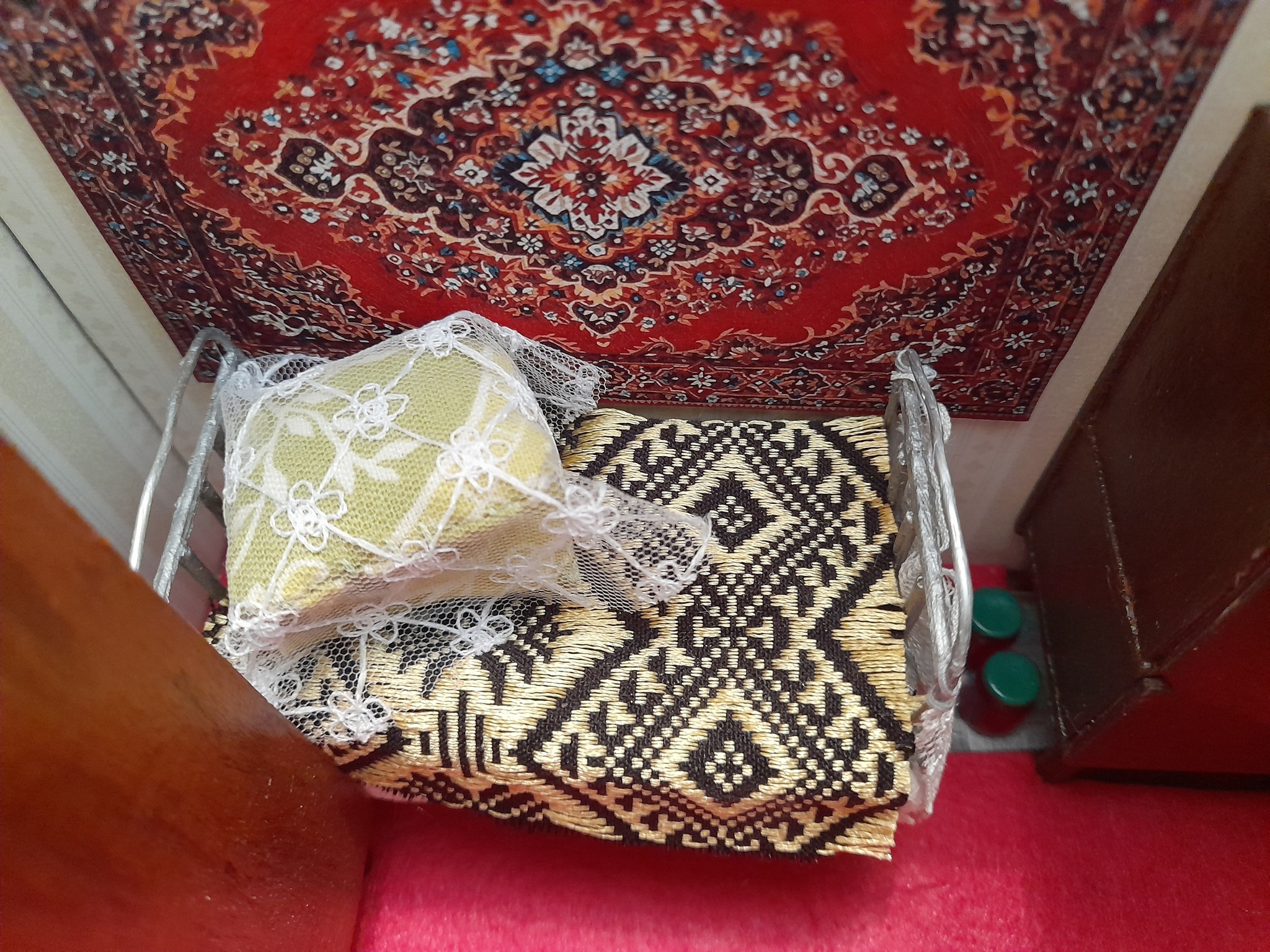 Немножко описание процесса. Масштаб не знаю, наверное, 1:14, размер комнаты 30*25*18 см, материалы - картон, акриловые краски, распечатки, ткани, клеёнка, шпажки, зубочистки, лак для ногтей, проволока, покупная швейная машинка (футляр сделан из картона).