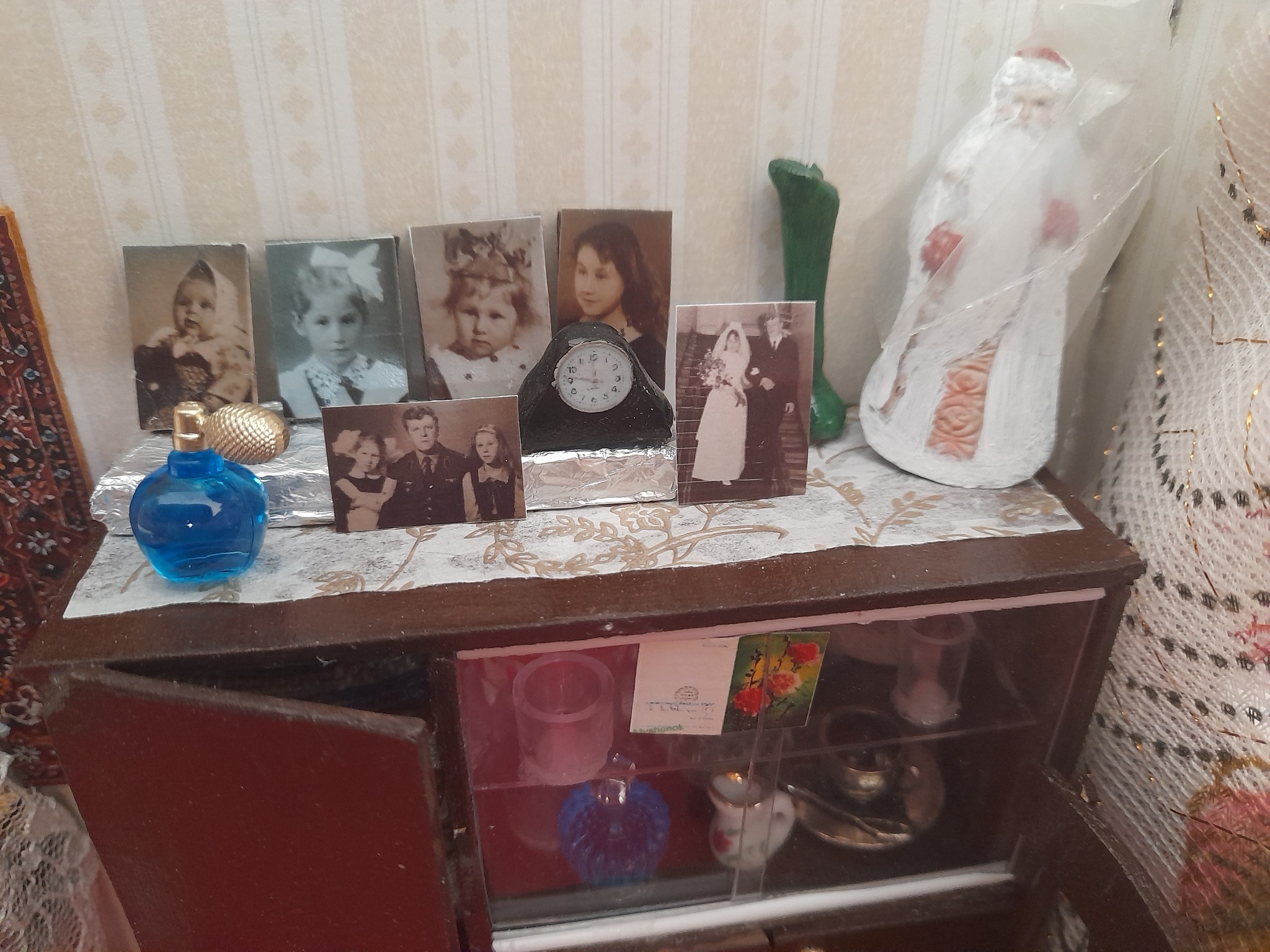 На серванте стоит Дед Мороз из пенопласта(кстати, жив до сих пор), накрытый пакетом, чтоб не пылился, забавная стеклянная ваза, "парадные" духи и конечно же, фотографии.