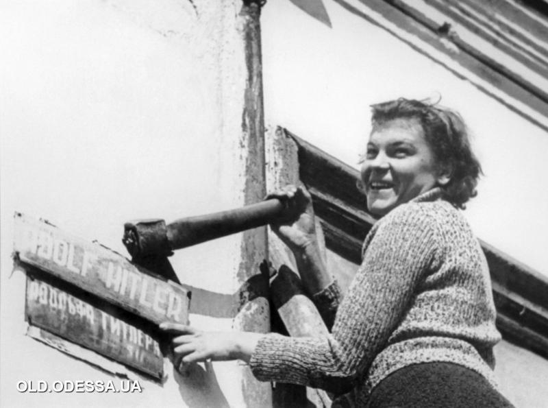 Одесса, ул. К. Маркса. Жительница Одессы снимает табличку с названием улицы, переименованной во время фашистской оккупации города. Фото Марка Редькина. 24 апреля 1944 г.