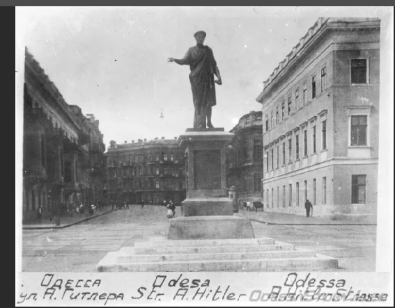 Ну и фотокарточка фашистских времён с памятником дюку Ришелье и с написанием города Одессы и улицы Гитлера на трёх языках: русском, румынском и немецком.