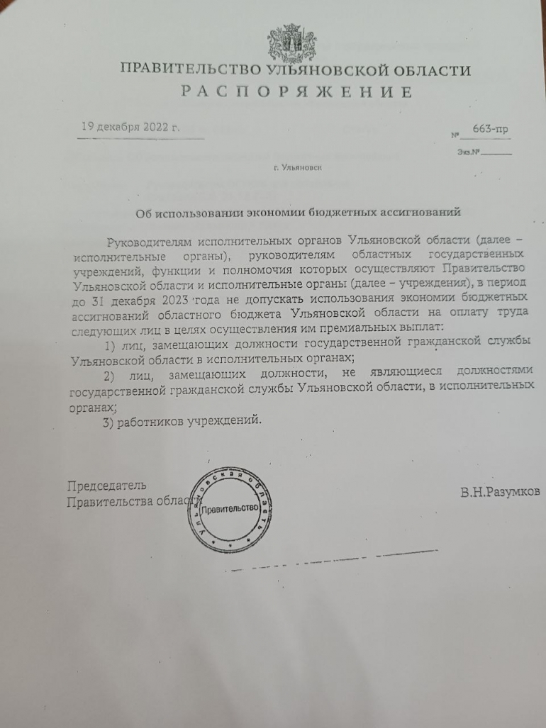 Неприятный сюрприз преподнесли ульяновские власти своим подчиненным перед новогодними праздниками. В этом году сотрудников министерств, комитетов, департаментов и областных государственных учреждений оставят без долгожданных новогодних премий. Об этом сообщается в Распоряжении правительства Ульяновской области от 19 декабря 2022 года №663-пр «Об использовании экономии бюджетных ассигнований» с печатью правительства и указанием председателя регионального правительства Владимира Разумкова.