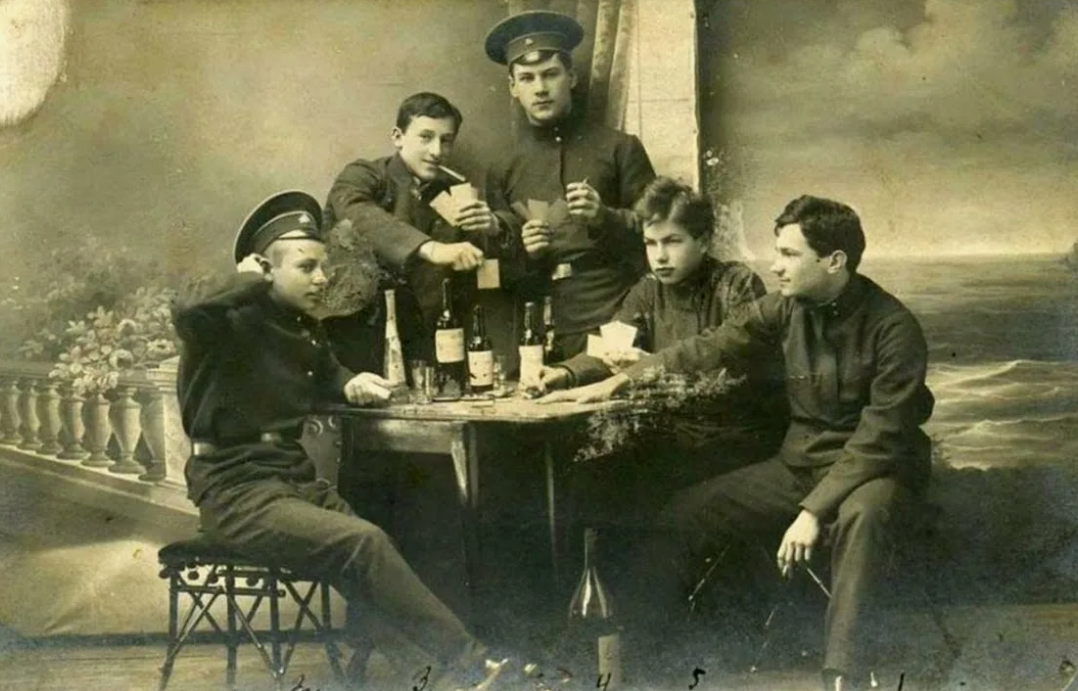 Как говорится, "это другое". Снимки 90-х - не показушные, с реальных пьянок. А на дореволюционных фото, как на втором снимке: парни пришли в фотосалон, расселись покрасивше, то ли с собой принесли, то ли фотограф им предоставил реквизит. Ведь они не пьют, не курят и в карты не играют. Сейчас птичка вылетит, все это уберется, и они покинут фотографию.